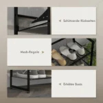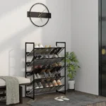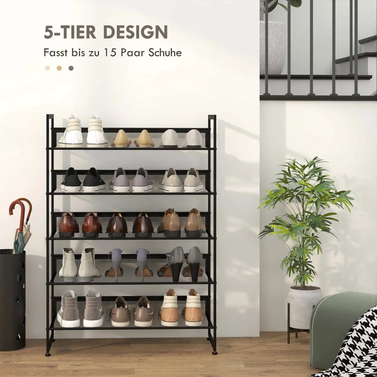 Optimizuokite savo gyvenamąją erdvę naudodami elegantišką HOMCOM batų lentyną, specialiai sukurtą šeimoms, norinčioms efektyviai išnaudoti kiekvieną centimetrą. Stilingas 5 pakopų dizainas suteikia vietos iki 15 batų porų (iki EU44) ir užtikrina optimalų vėdinimą dėl tinklinių lentynų. Apsauginis pagrindas viską saugiai laiko savo vietoje. Pagaminta iš dažyto plieno rėmo su reguliuojamomis pėdų pagalvėlėmis, derina funkcionalumą ir modernų dizainą. Puikiai tinka prieškambaryje ar svetainėje, kad sukurtumėte tvarką ir stilių.