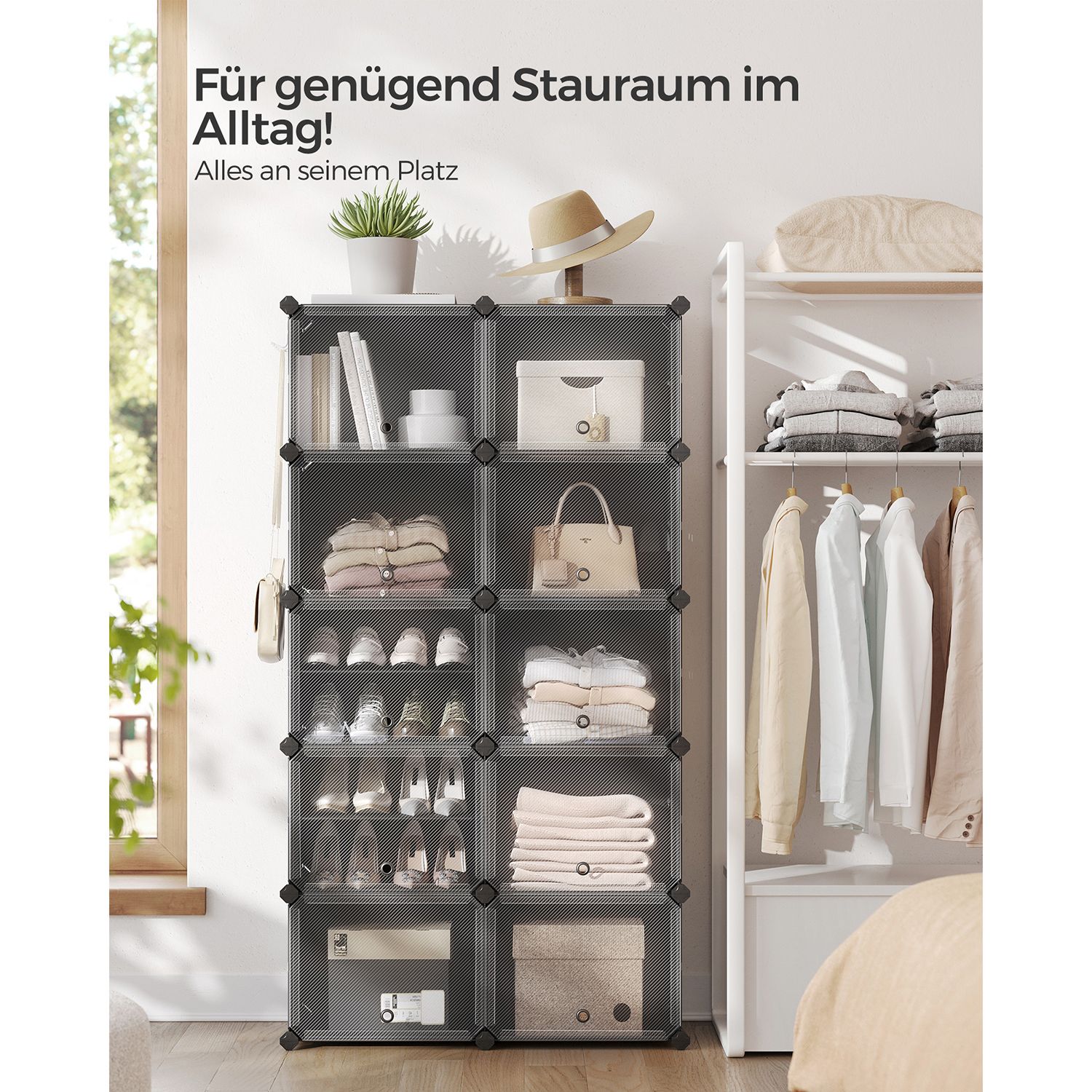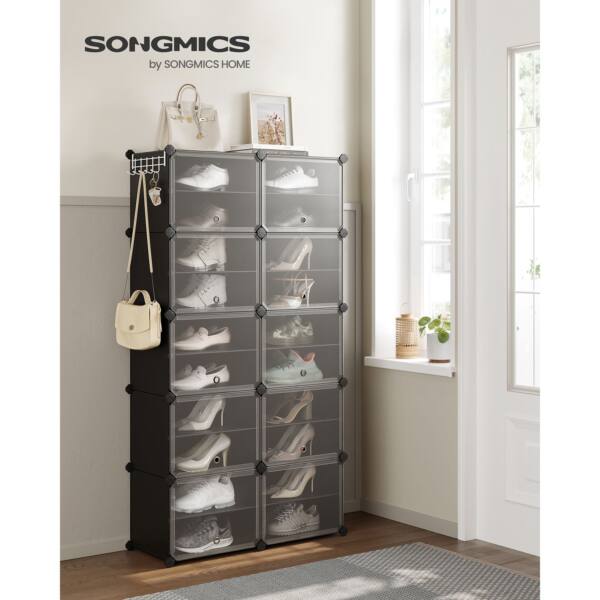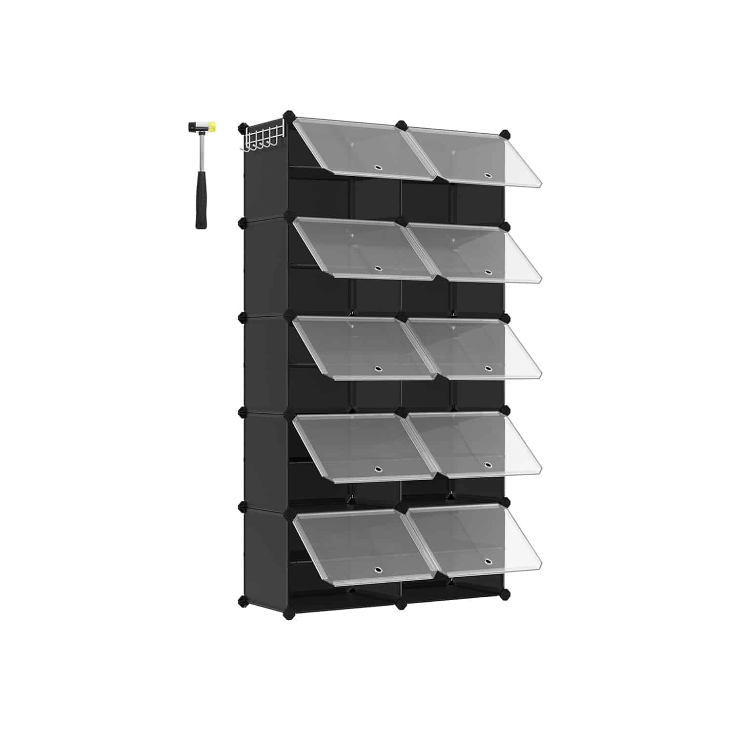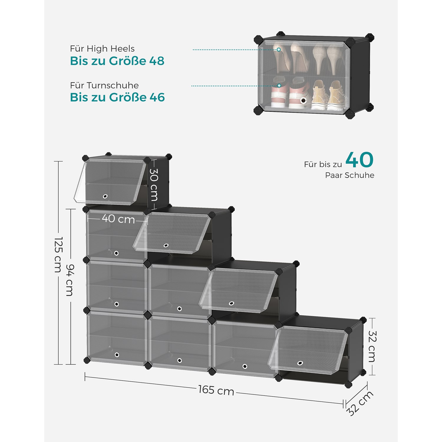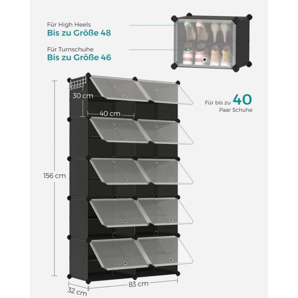 Ši juodos spalvos batų lentyna, sudaryta iš 10 batų dėžučių, yra puikus sprendimas tvarkingam ir stilingam batų laikymui. Pagaminta iš aukštos kokybės ABS plastiko jungčių, PP plastiko plokščių ir tvirto plieninio rėmo, ši lentyna užtikrina ilgaamžiškumą ir stabilumą.