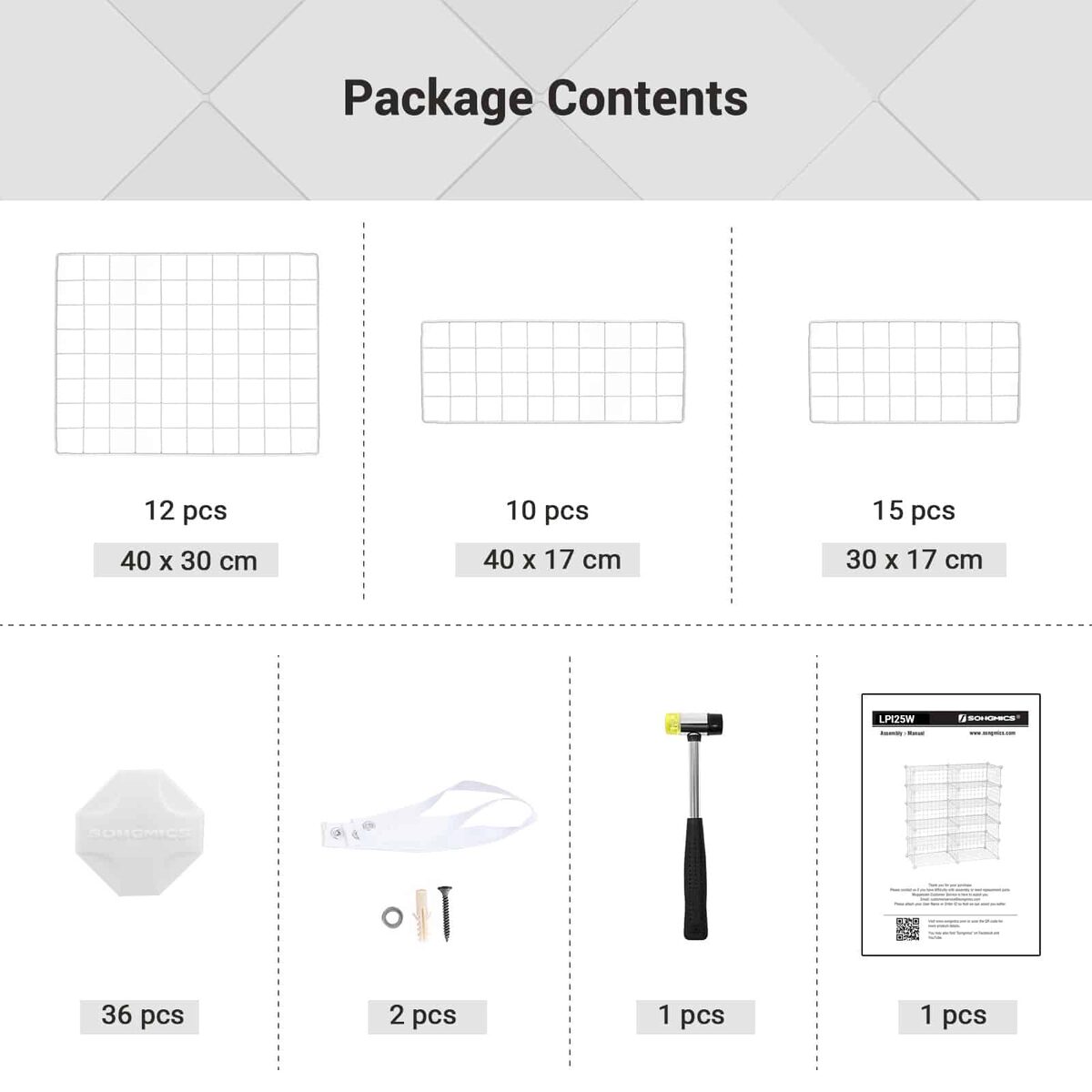 - 15 x baltų geležinių grotelių plokščių (30 x 17 cm)