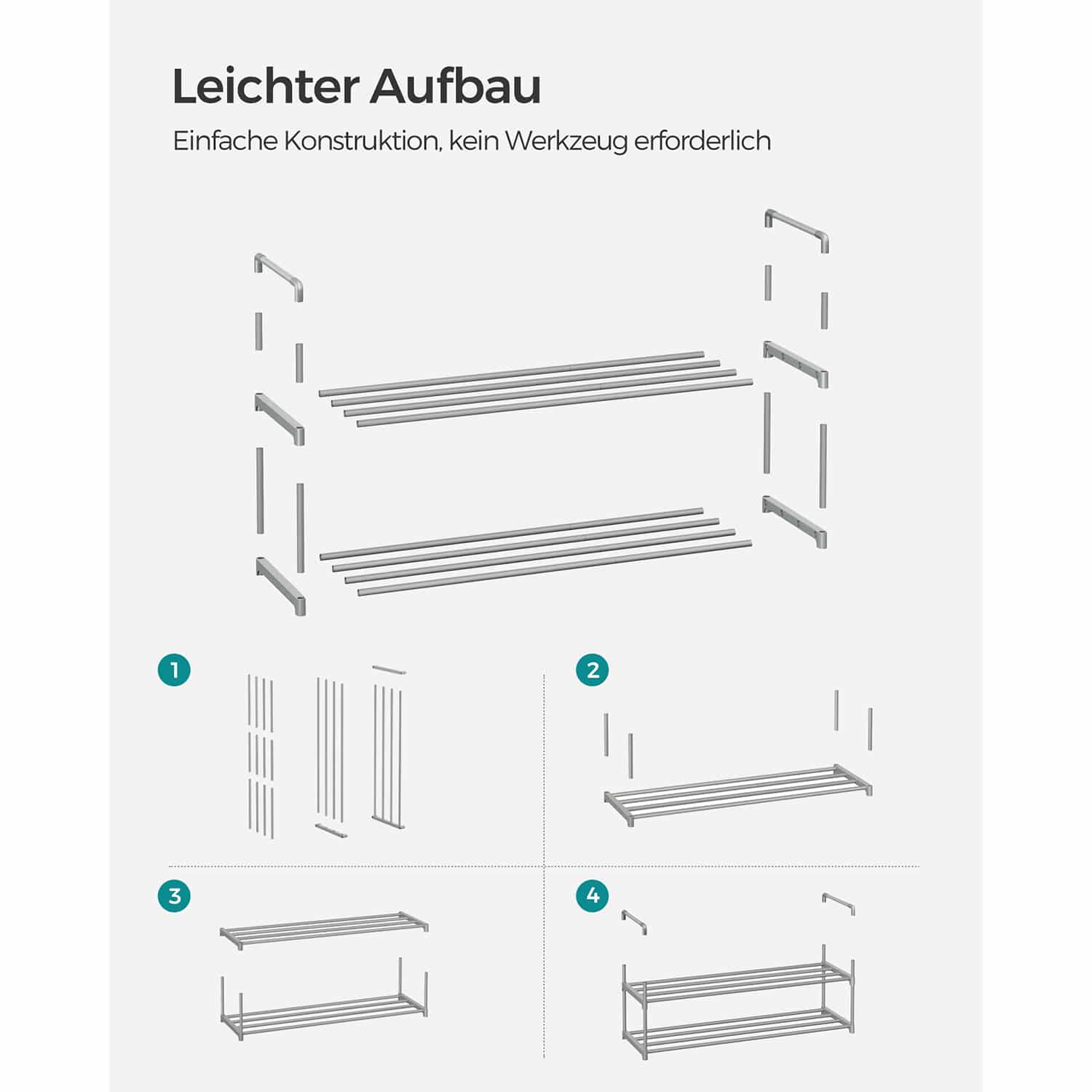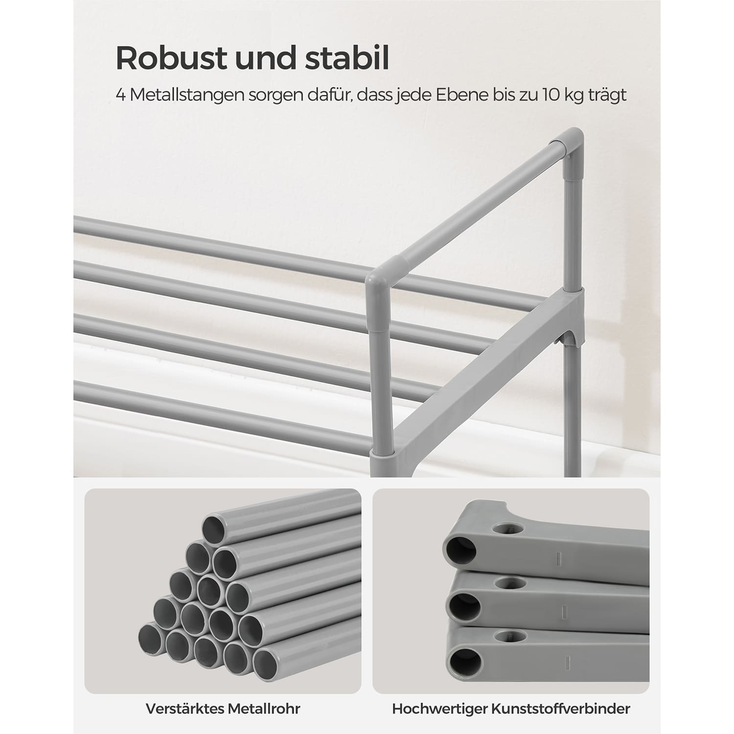 Pagaminta iš kokybiškų metalinių vamzdelių ir plastikinių jungčių, ši batų lentyna yra tvirta ir ilgaamžė. Jos kompaktiškas dydis leidžia lengvai pritaikyti bet kurioje patalpoje.