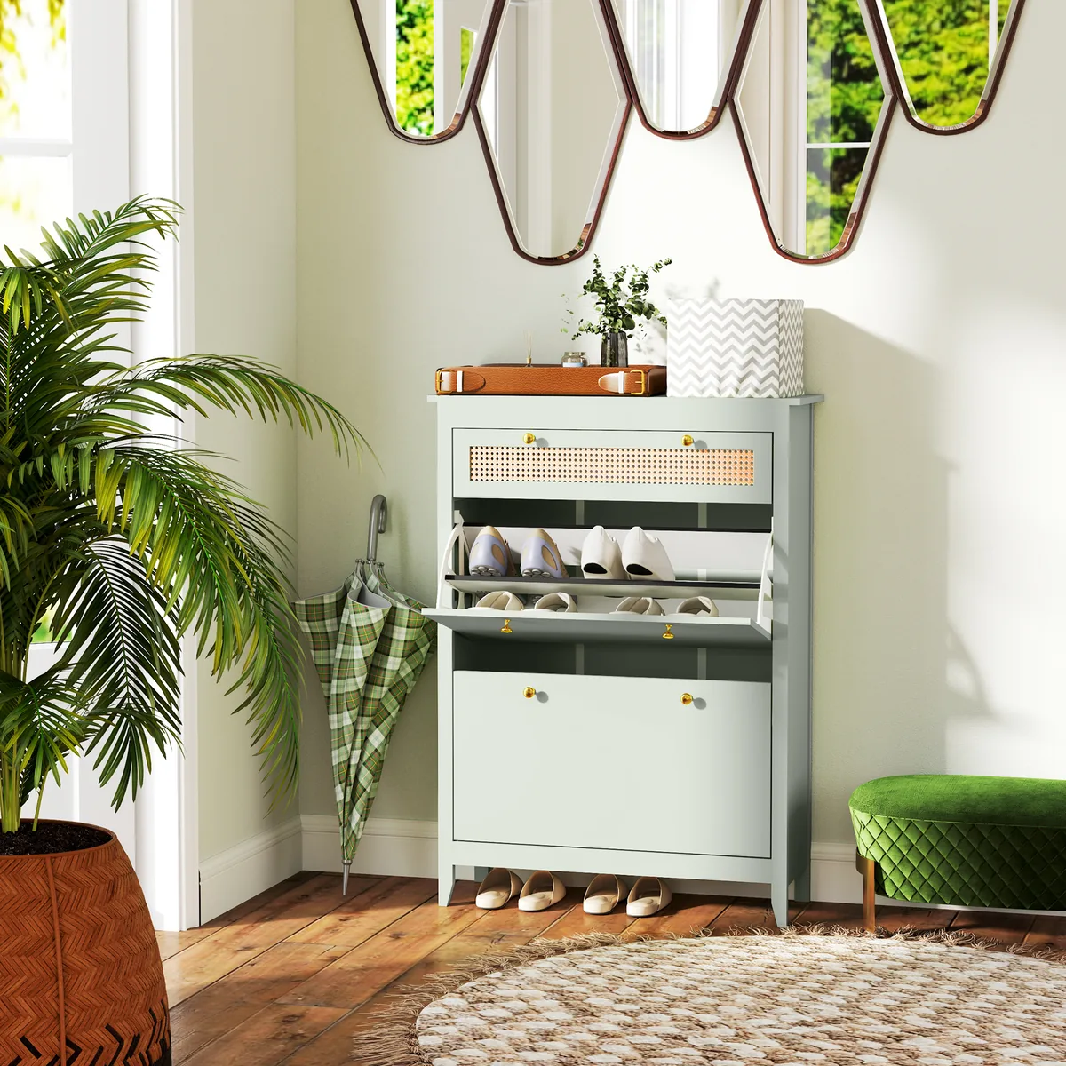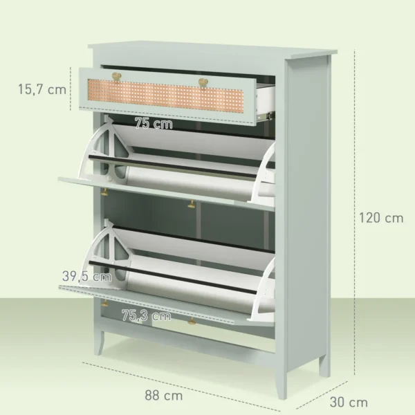Kompaktiška ir stilinga HOMCOM batų spintelė su stalčiumi, sukurta specialiai ankštoms erdvėms, talpina iki 12 porų batų. Batų lentynos lankstūs pakreipiami stalčiai su reguliuojamomis lentynomis palengvina skirtingų dydžių batų išdėstymą. Elegantiška rotango juostelė batų saugyklos stalčiuje taip pat suteikia ryškų akcentą.