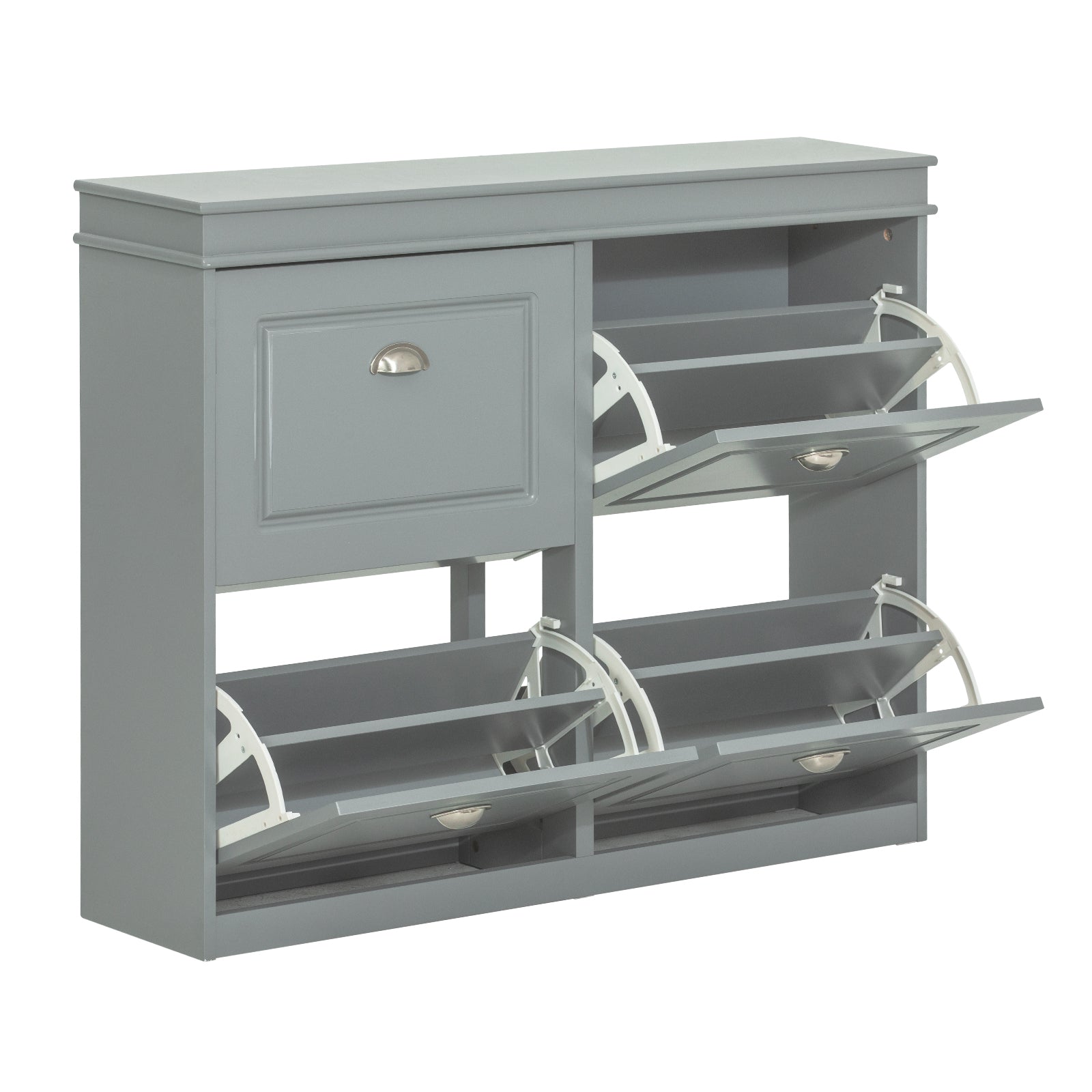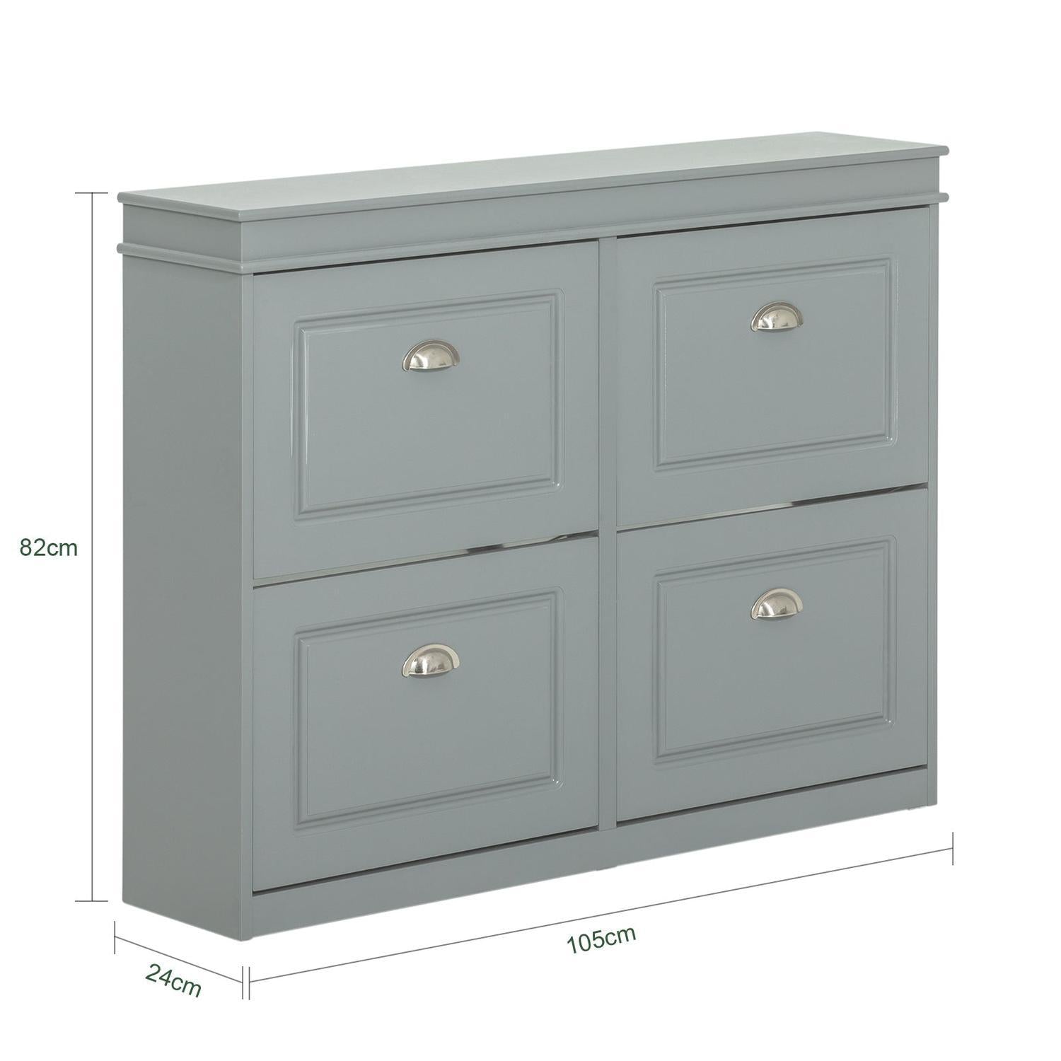 Batų spintelė 105x24x82cm, pilkos/sidabrinės spalvos, yra puikus sprendimas jūsų batų laikymui ir organizavimui. Ši spintelė ne tik padeda palaikyti tvarką, bet ir taupo vietą jūsų namuose.