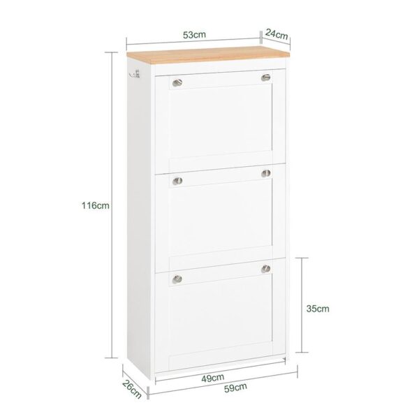 Ši batų spintelė 59x26x116 cm yra puikus pasirinkimas jūsų namams, nes jos paprastas dizainas puikiai dera su kitais baldais. Ji leidžia maksimaliai išnaudoti vertikalų erdvės plotą, todėl lengvai pasieksite savo batus.