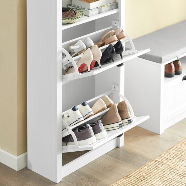 Batų spintelė 60x24x110cm, baltos/juodos spalvos, yra puikus sprendimas jūsų batų laikymui miegamajame ar prieškambaryje. Ši medinė spintelė ne tik padės išvengti netvarkos, bet ir sukurs šiltą bei jaukią atmosferą jūsų namuose.