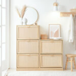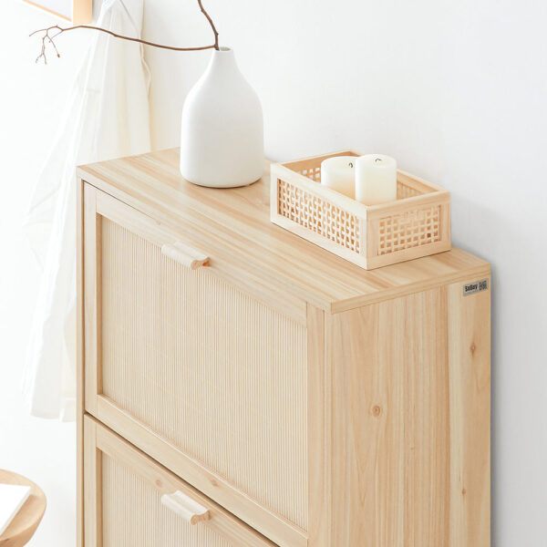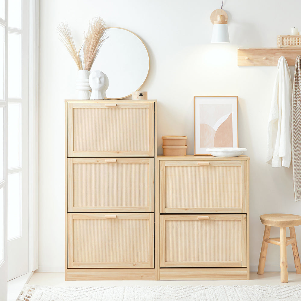 Tradicinis medžio faneros dizainas subtiliai imituoja masyvo medžio raštą, suteikdamas jaukią atmosferą jūsų kambariui. Batų spintelė turi tris patogias ištraukiamas dėžes, kurios padeda tvarkingai laikyti batus ir lengvai juos pasiekti.