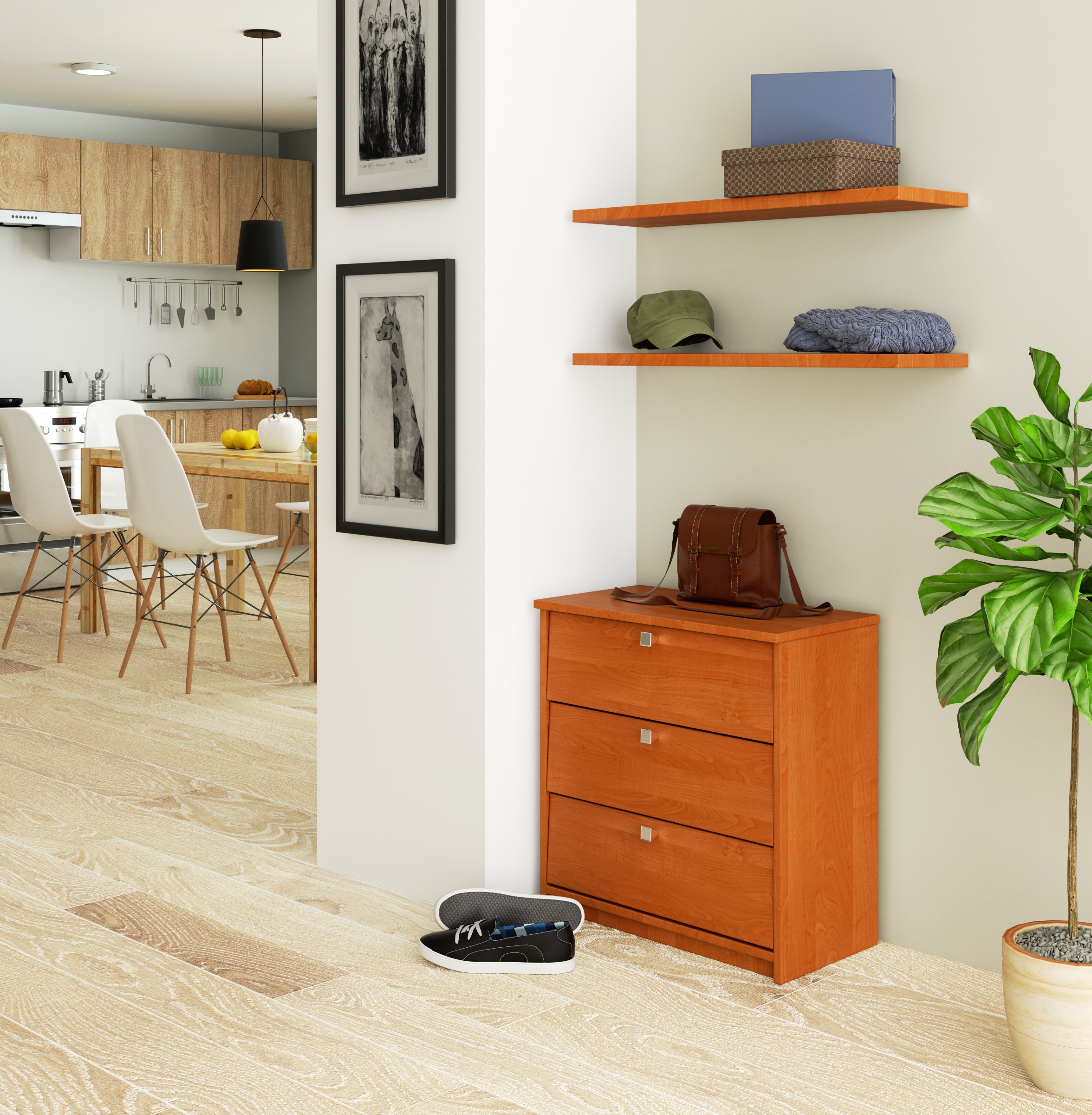 Kaip elgtis su batais, kurie nuolat išsibarstę salėje? Idealus sprendimas bus universalios alksnio spalvos batų spintelė. Tai baldas, kuris leis palaikyti tvarką net ir mažoje patalpoje. Maži matmenys ir patraukli kaina daro spintelę populiariu pasirinkimu besilankantiems mūsų internetinėje parduotuvėje. Dėl klasikinės baldų išvaizdos jie puikiai tinka bet kokiam išdėstymui. Trijuose atverčiamuose stalčiuose bus galima sutalpinti iki keliolikos batų porų. Spintelė pagaminta iš laminuotos plokštės, kurios ilgaamžiškumas viršija vidutinį ir pasižymi dideliu atsparumu dilimui. ABS ratlankiu padengti kraštai užtikrina atsparumą pažeidimams, o tai ir yra pristatomo modelio privalumas. Tarp mūsų paruoštų variantų rasite ir kitų šios spalvos batų spintelių, kurios skiriasi stalčių skaičiumi. Alksnio spalvos pastatoma spinta puikiai papildys bet kurią funkcionaliai įrengtą salę, taip pat miegamąjį ar drabužių spinta. – Spintelė pagaminta iš dilimui atsparios laminuotos plokštės – Durų fasadai iš laminuotos plokštės – Su vyriais durys – Atverčiamų durų viduje yra 3 lentynos – Matomi kraštai, padengti ABS briauna, padidina atsparumą pažeidimams – Satino durų rankenos – Savarankiškai surenkama spintelė – Pateikiama instrukcija – Garantija 24 mėn.