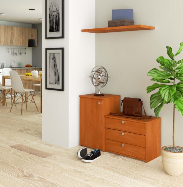 Pristatomas pasiūlymas skirtas žmonėms, kurie yra prieškambario ar spintos įrengimo stadijoje ir ieško solidžiai pagamintų baldų klasikiniame variante. Mūsų pristatoma praktiška batų spintelė – tai sprendimas, skirtas tradicionalistams, vertinantiems patikrintus, funkcionalius sprendimus. Jis susideda iš dviejų dalių – atidaromas durelėmis, įskaitant dvi lentynas ir tris stalčius batams. Dėl to spintoje galima sutalpinti visus reikalingus daiktus prieškambaryje – ne tik batus, bet ir kepures, šalikus bei pirštines. Verta dėmesio spintos kaina ir solidus apdirbimas. Baldai puikiai dera su kitais šios kolekcijos gaminiais. Dėl to galėsite įrengti efektyvų ir funkcionalų kambarį, kuris pateisins net išrankiausių mūsų internetinės parduotuvės klientų lūkesčius. Pastatoma spintelė pagaminta iš alksnio spalvos laminuotos plokštės. Ratlankis buvo faneruotas ABS. – spintelė pagaminta iš dilimui atsparios laminuotos plokštės – Palenkiami stalčiai – Stalčių fasadai iš laminuotos plokštės – 3 lentynos atverčiamuose stalčiuose – durelių viduje yra viena lentyna – matomi kraštai, padengti ABS apvadu, kad padidėtų patvarumo pažeidimas – Sidabrinės stalčiaus ir durų rankenos – Savarankiškai surenkama komoda – Instrukcija pateikiama – 24 mėnesių garantija