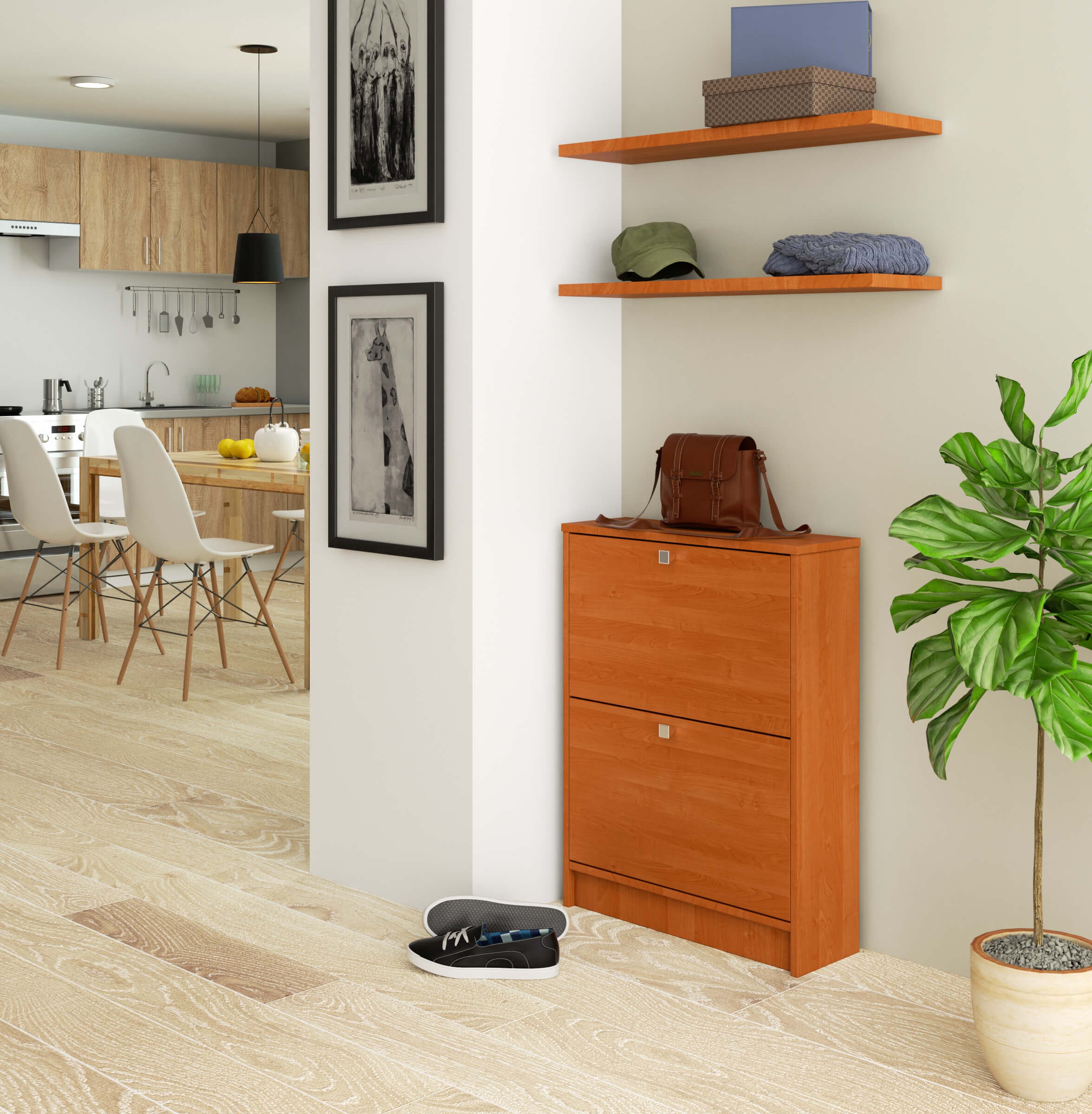 Prieškambaris yra vieta, kuri neabejotinai yra kiekvieno buto vitrina. Būtent todėl verta pasirūpinti nepriekaištinga jo išvaizda. Praktiška batų spintelė puikiai tiks sutvarkyti visoje patalpoje išsibarsčiusią avalynę. Mūsų pristatomas alksnio spalvos modelis – paprastas ir tuo pačiu labai elegantiškas sprendimas, kuris teigiamai nustebins dizaino ir kokybės derinį vertinančius žmones. 80 cm aukščio ir 60 cm pločio spinta yra Pagaminta iš patvarios laminuotos plokštės, kuri itin atspari įbrėžimams. Dviejuose talpiuose pakreipiamuose stalčiuose telpa nuo kelių iki keliolikos batų porų. Tai praktiškas sprendimas, kurį įvertins tvarka besirūpinantys ir batus tvarkyti norintys žmonės. Spintelę galite įsigyti mūsų internetinėje parduotuvėje už itin palankią kainą. Lengvai valoma, praktiškai atidaroma elegantiška spintelė puikiai papildys bet kurią salę, taip pat ir drabužių spinta. – Spintelė iš dilimui atsparios laminuotos plokštės – Durų fasadai iš laminuotos plokštės – Atverčiamos durys – Durų viduje yra vienos eilės plastikinis batų krepšys – Matomi kraštai padengti ABS fanera, kad būtų didesnis atsparumas sugadinti – Sidabrinės durų rankenos – Spintelė savarankiškam surinkimui – Pridedamos instrukcijos – Garantija 24 mėnesių