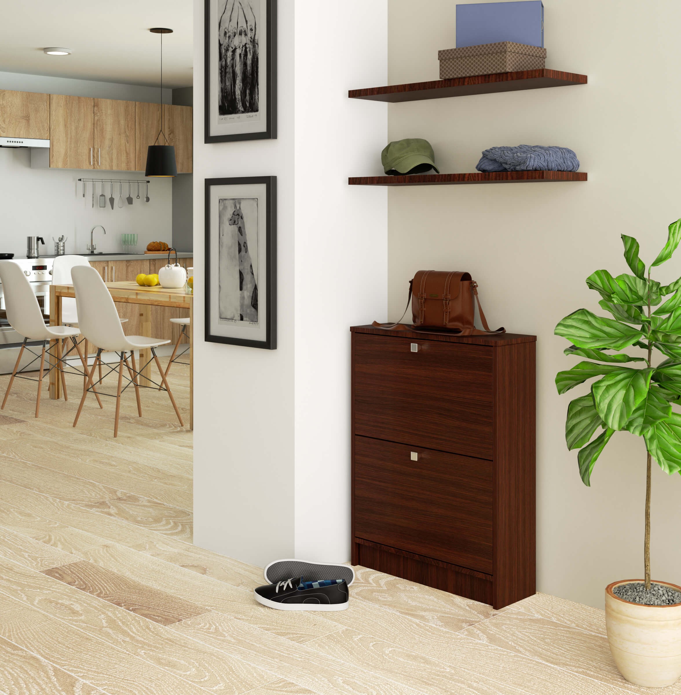Batų spintos yra praktiški prieškambario baldai, kurie yra labai populiarūs ir yra kiekvieno buto vitrina. Jie leidžia palaikyti tvarką ir tvarkyti batus ne tik prieškambaryje, bet ir miegamajame ar persirengimo kambaryje. Prie lauko durų nuolat kaupiami batai su laiku gali erzinti, o batų spintelė leis paslėpti ir sutvarkyti batus kiekvienuose namuose. Batų spinta, kurią su malonumu pristatome, primena komodą. Vietoje spintelių ar stalčių jame sumontuotos dvi batų spintelės, kuriose nesunkiai telpa kelios ar net keliolika batų porų. Stalčiai nusilenkia, kad būtų lengva pasiekti paslėptus daiktus. Batus tokioje spintelėje galima laikyti tiek urmu, tiek dėžėse. Baldai pagaminti iš patvarios, patvarios ir įbrėžimams atsparios laminuotos plokštės madingos wenge spalvos, kurios pageidauja mūsų internetinės parduotuvės klientai. Taip pat verta paminėti efektyvias rankenas. – Spintelė pagaminta iš trinčiai atsparios laminuotos plokštės – Durų fasadai iš laminuotos plokštės – Atverčiamos durys – Durų viduje yra vienos eilės plastikinis batų krepšys – Matomi kraštai padengti ABS fanera, kad būtų didesnis atsparumas pažeidimams – Sidabrinės durų rankenos – Savaiminio surinkimo spintelė – Instrukcija pridedama – Garantija 24 mėn.