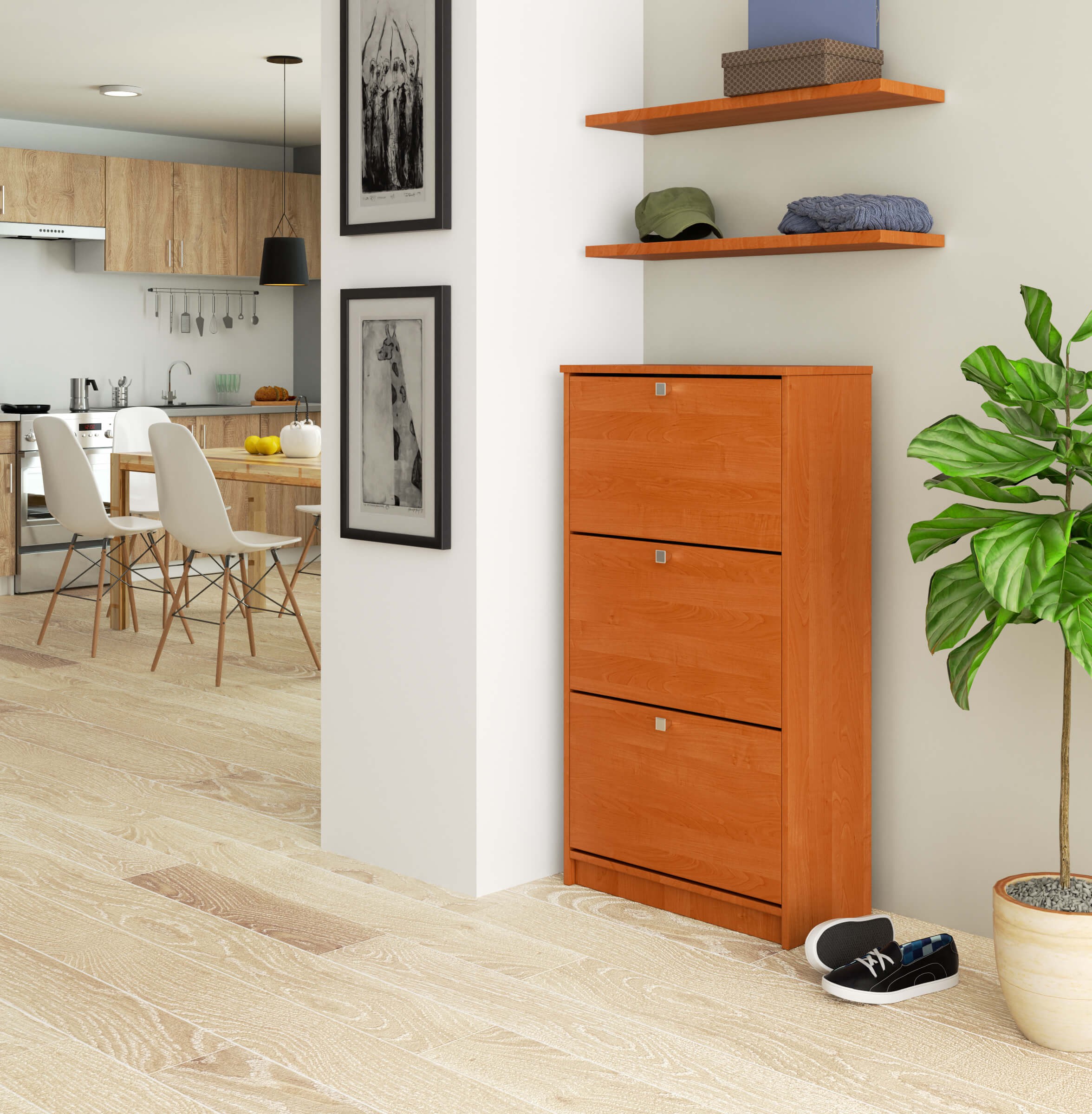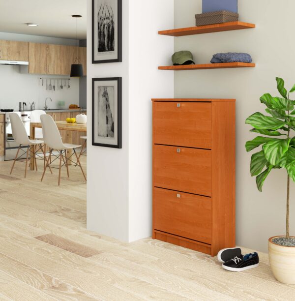 Alksnio spalvos batų spinta susideda iš trijų lentynų batams laikyti. Baldas pagamintas iš trinčiai atsparios laminuotos plokštės, o jų kraštai padengti atsparumą pažeidimams užtikrinančia ABS briauna. Paprastas stilius, funkcionalumas ir aukšta kokybė leido sukurti baldą, kuris puikiai tiks palaikyti tvarką su batais kiekvienoje salėje. Spintelė pagaminta iš kokybiškos gamintojo Kronospan laminuotos plokštės, kurios storis 16 milimetrų. Gaminys skirtas montuoti savarankiškai. Spintelė tikrai puikiai tiks kiekviename koridoriuje, teigiamai nustebindama nesenstančia išvaizda ir kasdienio naudojimo patogumu. Alksnio spalvos baldui galite pasirinkti kitus mūsų pasiūlyme esančius prieškambario išdėstymus. – Spintelė pagaminta iš kokybiškos gamintojo Kronospan laminuotos plokštės, 16 mm storio, atsparus trinčiai – Durų fasadai pagaminti iš laminuotos plokštės – pakreipiamos durelės – Turi 3 dviejų eilių plastikinius krepšelius – Matomi kraštai padengti ABS apvadu, padidintu atsparumu pažeidimams – Statininės spalvos durų rankenos – Spintelė tam pačiam drąsus surinkimas – pridedamas vadovas – 24 mėnesių garantija