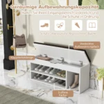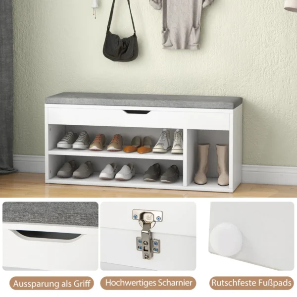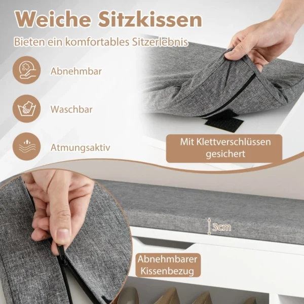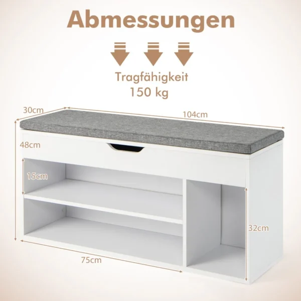 Batų suoliukas 104x48x30 cm baltos ir pilkos spalvos yra funkcionali ir kompaktiška interjero detalė, skirta patogiai persiauti ir sandėliuoti batus. Suoliukas turi nuimamą sėdynės pagalvėlę bei kelias lentynas, kurios padeda tvarkingai laikyti įvairius smulkius daiktus.