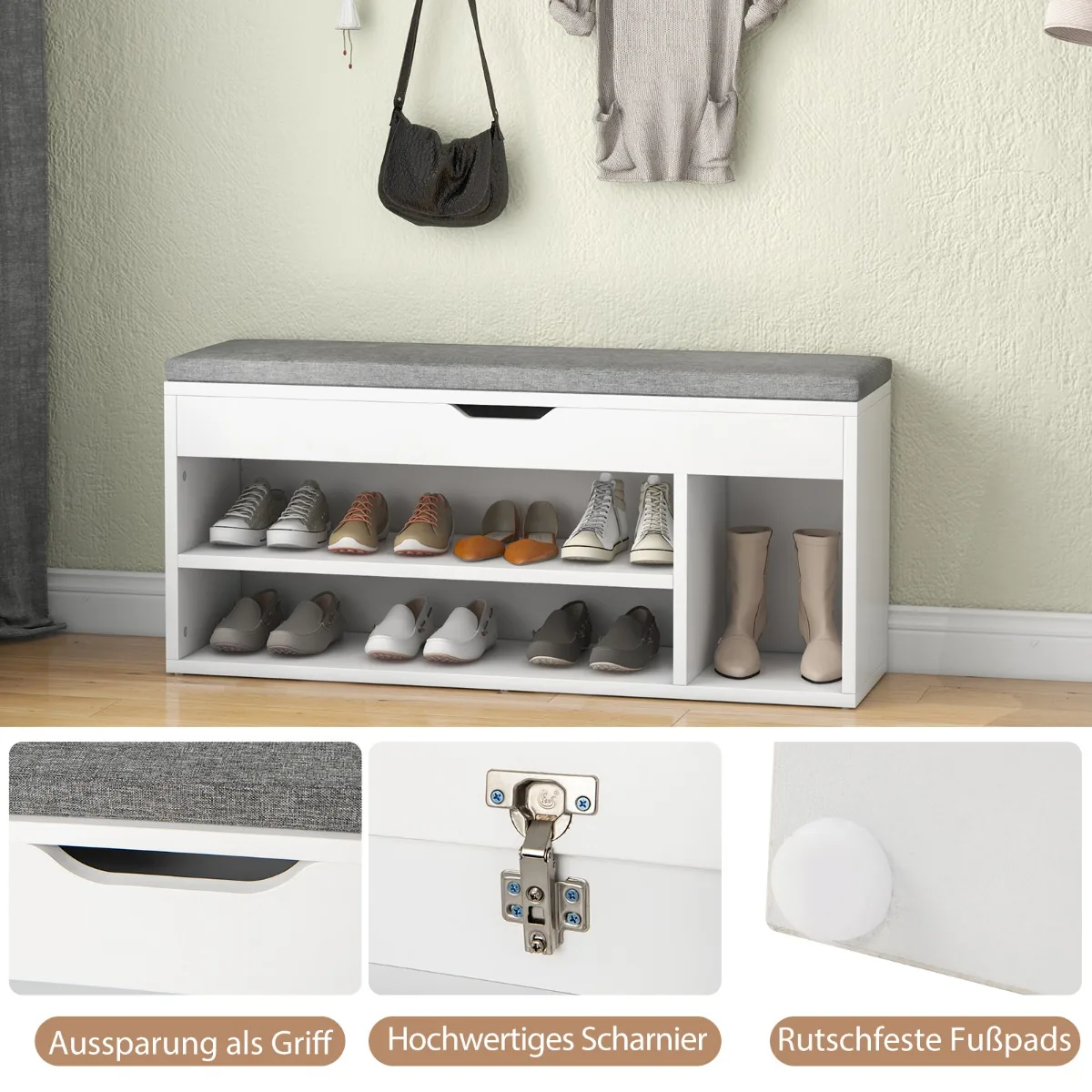 - Batų spintelė su sėdyne turi tris apatinius skyrius batams ir papildomą skyrių daiktams po atlenkiamu dangteliu.