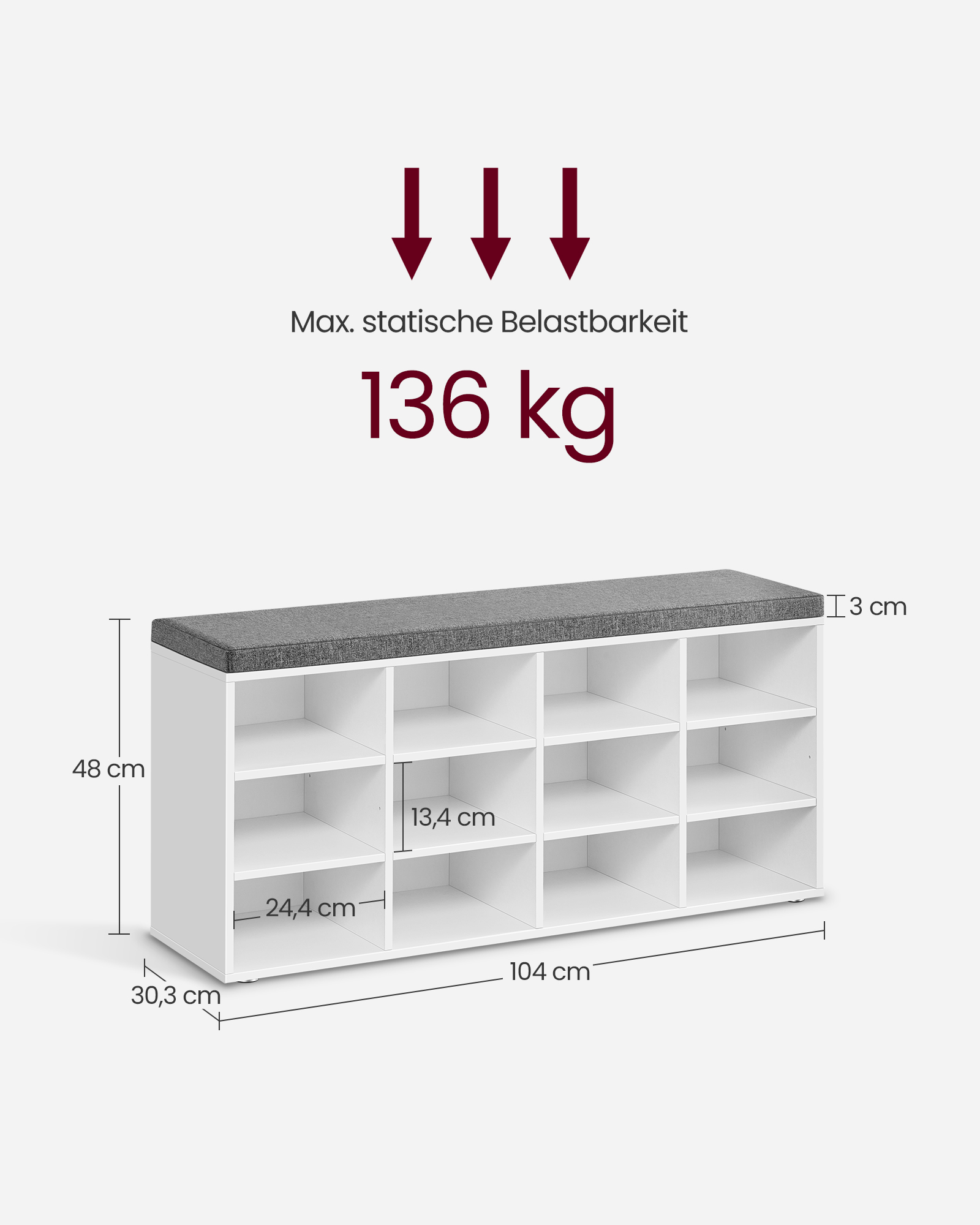Šis batų suoliukas su 12 atvirais skyriais yra idealus sprendimas tiems, kurie vertina tvarką ir stilių. Jo universalus dizainas leidžia lengvai priderinti prie bet kokio interjero, o praktiškos funkcijos padės išlaikyti jūsų namus tvarkingus ir organizuotus.