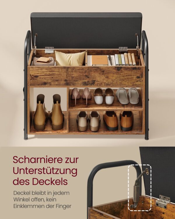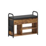 Šis batų suoliukas su lentynomis yra puikus pasirinkimas tiems, kurie vertina funkcionalumą ir stilių. Jo vintažinė ruda-juoda spalva ir kokybiškos medžiagos užtikrina, kad jis tarnaus jums ilgus metus. Pasirinkite šį suoliuką ir suteikite savo namams tvarkos ir elegancijos!