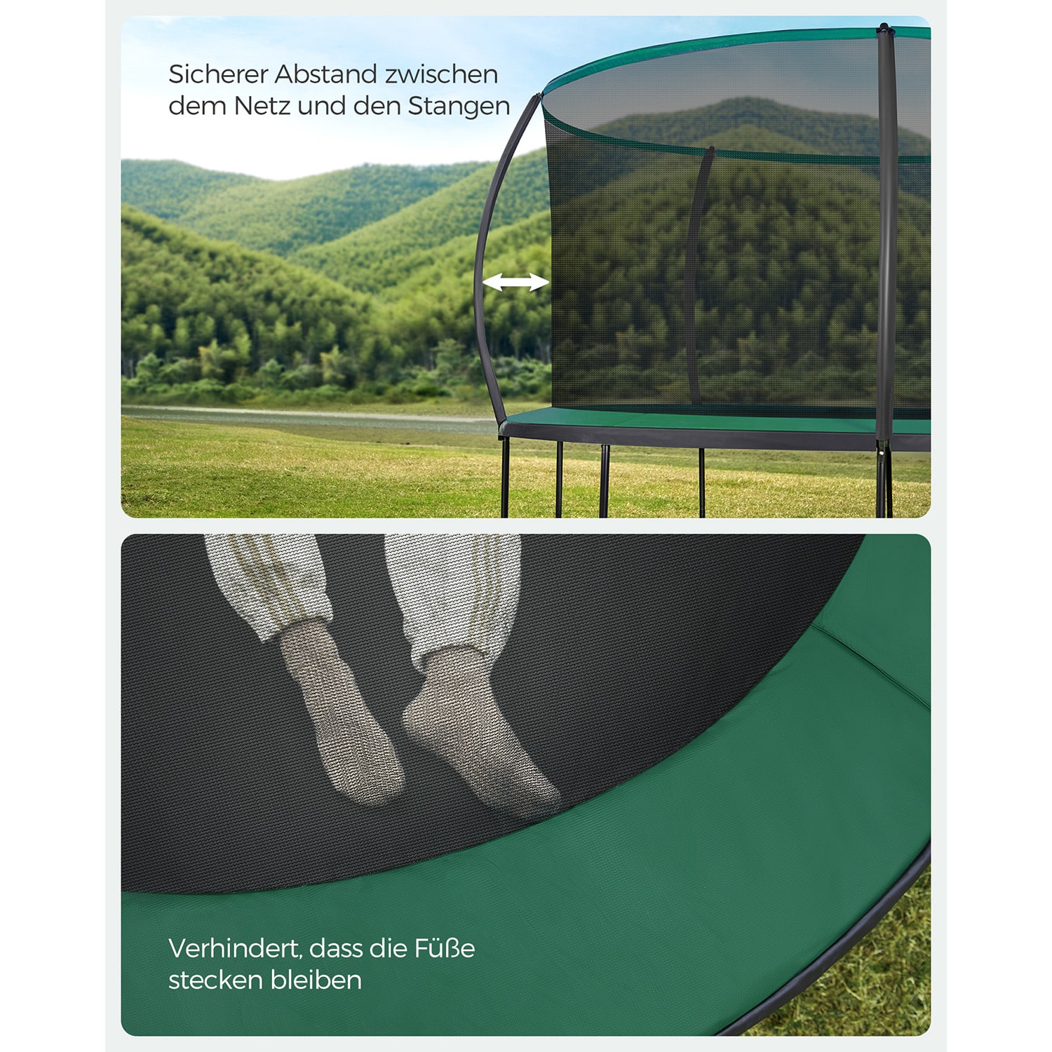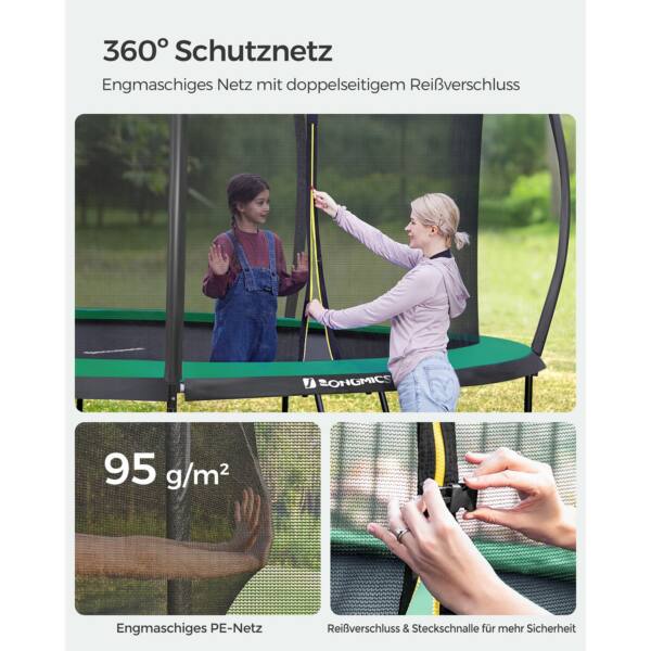 - Medžiaga: Rėmas: Cinkuoti plieniniai vamzdžiai; Krašto danga: 500D PVC, 15 mm storio EPE putplastis, 130 g/m² PE; Šokinėjimo kilimėlis: PP; Apsauginis tinklas: 95 g/m² PE; Stulpų apsauga: PE putų kamšalas, PVC apsauginė medžiaga; Spyruoklės: Cinkuotas plienas
