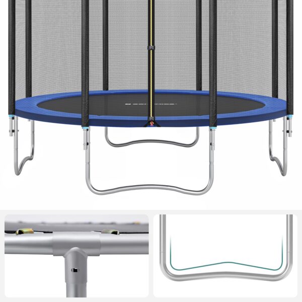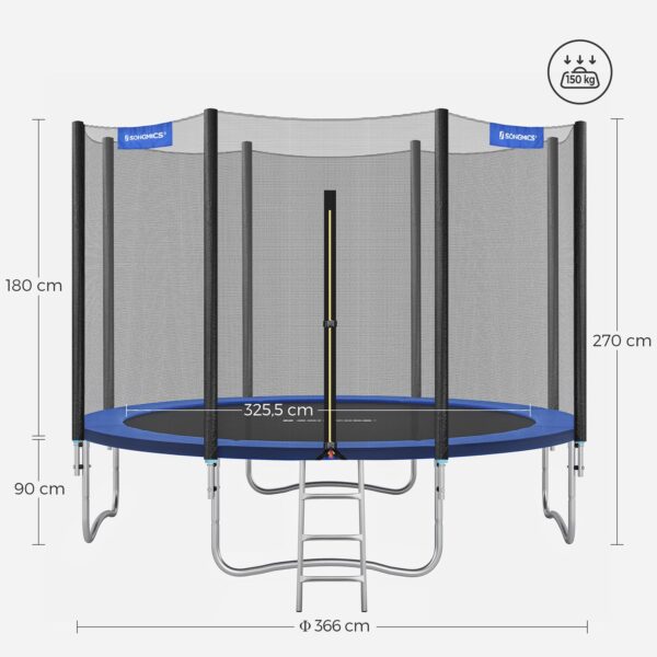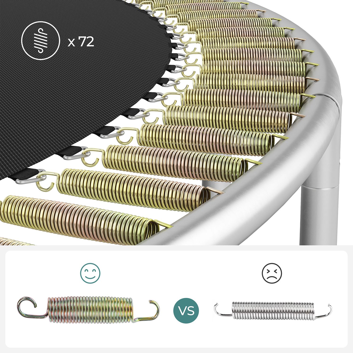 Saugumas yra svarbiausias prioritetas. Dėl šios priežasties šis batutas aprūpintas itin glaudžiu apsauginiu tinkleliu, kuris ypač gerai amortizuoja smūgį. Be to, tinklo stulpai ir spyruoklės yra padengti EPE putomis, kurios taip pat sumažina traumų riziką.