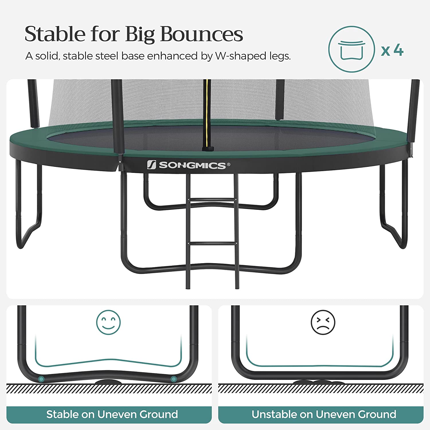 Saugumas yra svarbiausias prioritetas. Žinoma, šokinėjimas ant batuto turėtų būti visų pirma įdomus, tačiau negalima pamiršti saugumo. Dėl šios priežasties šis batutas aprūpintas sandariu apsauginiu tinkleliu, kuris ypač gerai amortizuoja smūgį. Be to, stulpai tvirtinami prie tinklo išorės ir padengiami EPE putomis, kurios taip pat sumažina traumų riziką.