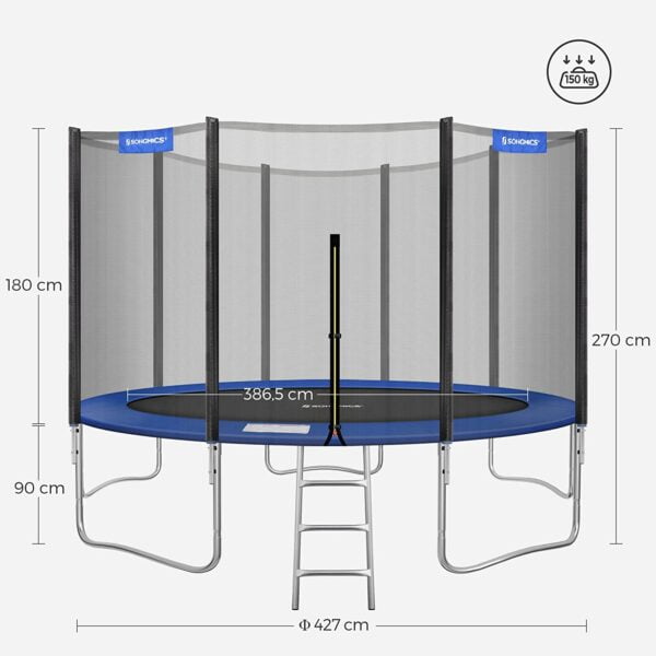 Šis batutas Ø 427 cm su apsauginiu tinkleliu, kopėčiomis ir paminkštintais stulpais yra puikus pasirinkimas aktyviam laisvalaikiui. Jis yra mėlynos spalvos ir pagamintas iš aukštos kokybės medžiagų, užtikrinančių ilgaamžiškumą ir saugumą.