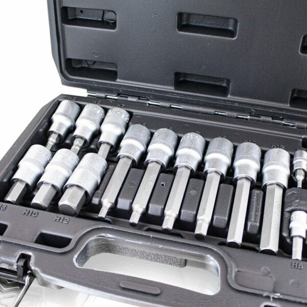 Lizdinių šešiabriaunių veržliarakčių rinkinys Rinkinį sudaro 18 šešiabriaunių lizdų, pagamintų iš patvaraus ir patvaraus chromo vanadžio plieno. Puikus rinkinys „pasidaryk pats“ entuziastams ir profesionalioms dirbtuvėms, patogi ir praktiška įrankių dėžė Rinkinio turinys: 6 x 1/4″ 55L antgalių lizdai: HW 3,4,5,6,7,8 6 x 1/2″ antgalių lizdai 30L : HW 6,7,8,10,12,14 6 x 1/2″ antgalių lizdai 75L: HW 5,6,7,8,10,12 1 x plastikinė dėžutė Specifikacijos: medžiaga: chromo vanadžio plienas