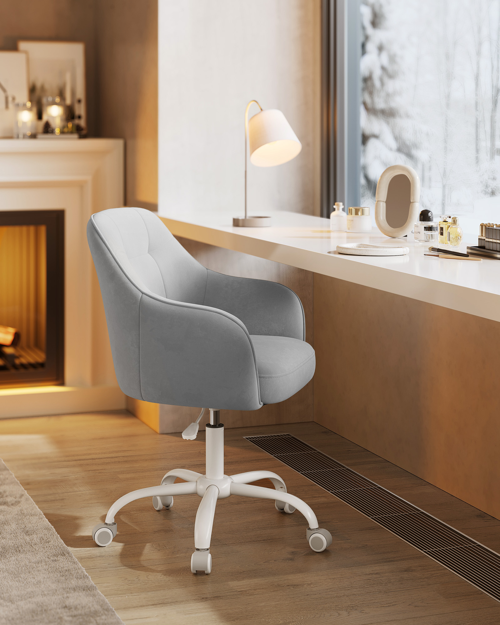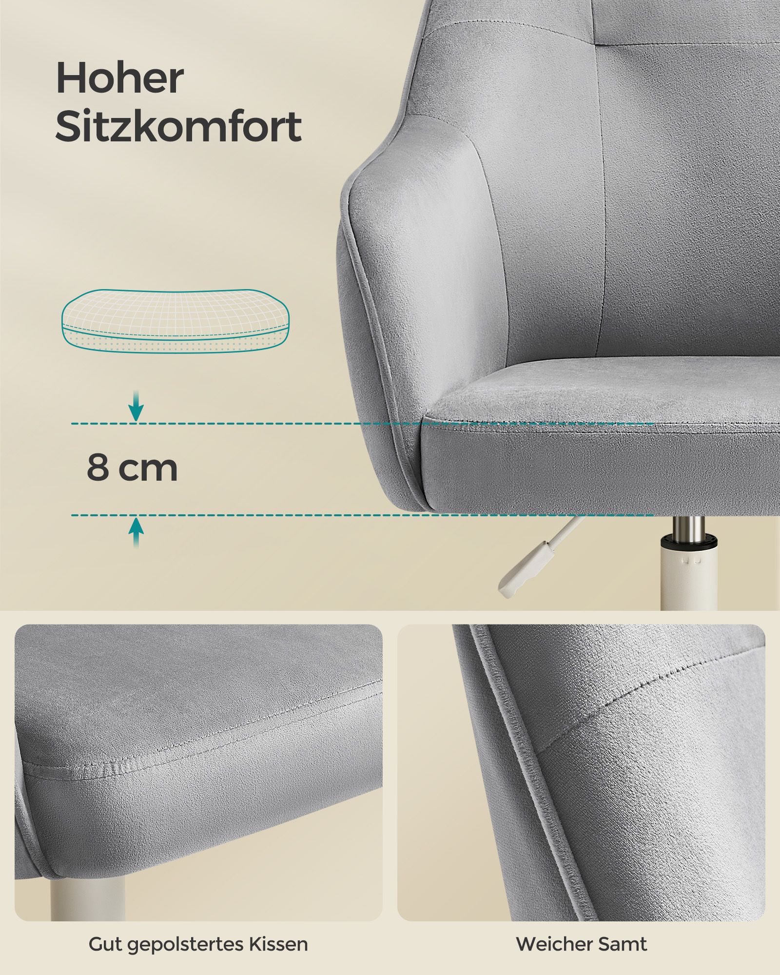 Ši biuro kėdė ne tik puikiai atrodo, bet ir suteikia optimalų komfortą ilgoms darbo valandoms. Reguliuojamas sėdynės aukštis leidžia pritaikyti kėdę pagal individualius poreikius, o tvirtas plieno ir faneros rėmas užtikrina stabilumą ir patikimumą. Aksominė apdaila suteikia prabangos pojūtį, o PU ratai leidžia lengvai judėti po darbo erdvę.