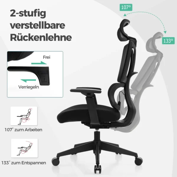 - 2 lygio atlošas (107° ir 133°) darbo ir poilsio padėčioms.