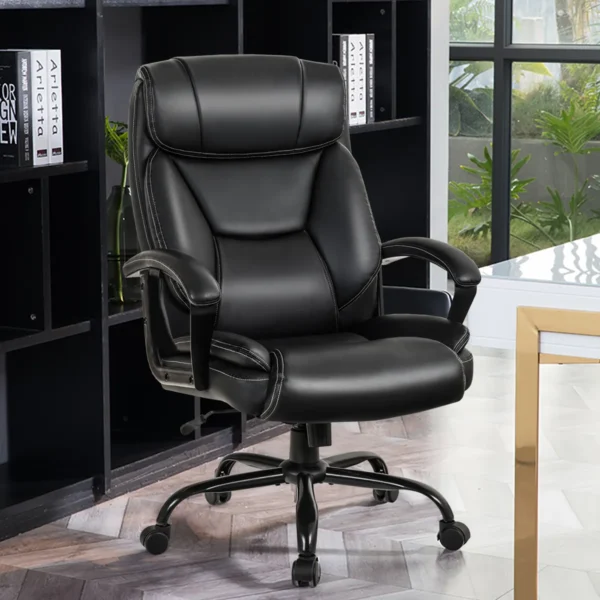 - Ergonomiška kėdė su plačiu aukštu atlošu ir paminkšintais porankiais, prisitaikanti prie kūno linkių.