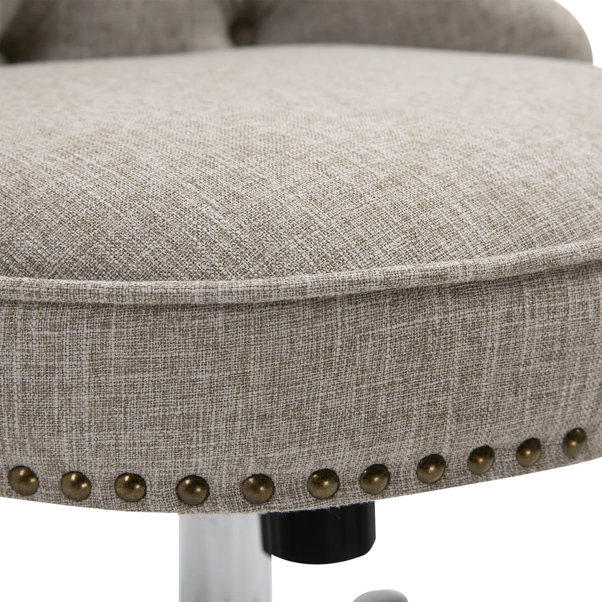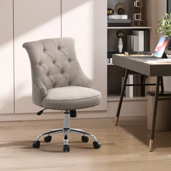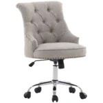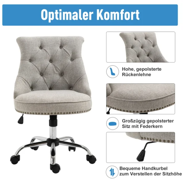 Šioje elegantiškoje pasukamoje HOMCOM kėdėje elegantiškai suderinta forma ir funkcija. Atsisėskite ant aukšto, paminkštinto atlošo su Chesterfield stiliaus mygtukų detalėmis. Dėl ergonomiškos sėdynės formos ir storo putplasčio paminkštinimo jūsų besisukanti kėdė yra patikimas partneris net ir ilgai sėdint. Šviesiai margas lininis užvalkalas ir subtilios apmušalų nagų detalės jūsų nauja minkšta kėdė traukia akį, kuri vis dar pakankamai subtili, kad jaustųsi kaip namuose bet kokiame interjero stiliuje. Tačiau neapleidžiama ir funkcija: dėl stabilaus pagrindo rėmo su penkiais statramsčiais ir sklandžiai veikiančiais ratukais bei 360 laipsnių kampu pasukamos sėdynės galite lengvai pasiekti kiekvieną biuro vietą ir būti be vargo mobilūs. Lengvai reguliuokite aukštį naudodami svirtį ir laukite patogių ir produktyvių valandų prie savo stalo.