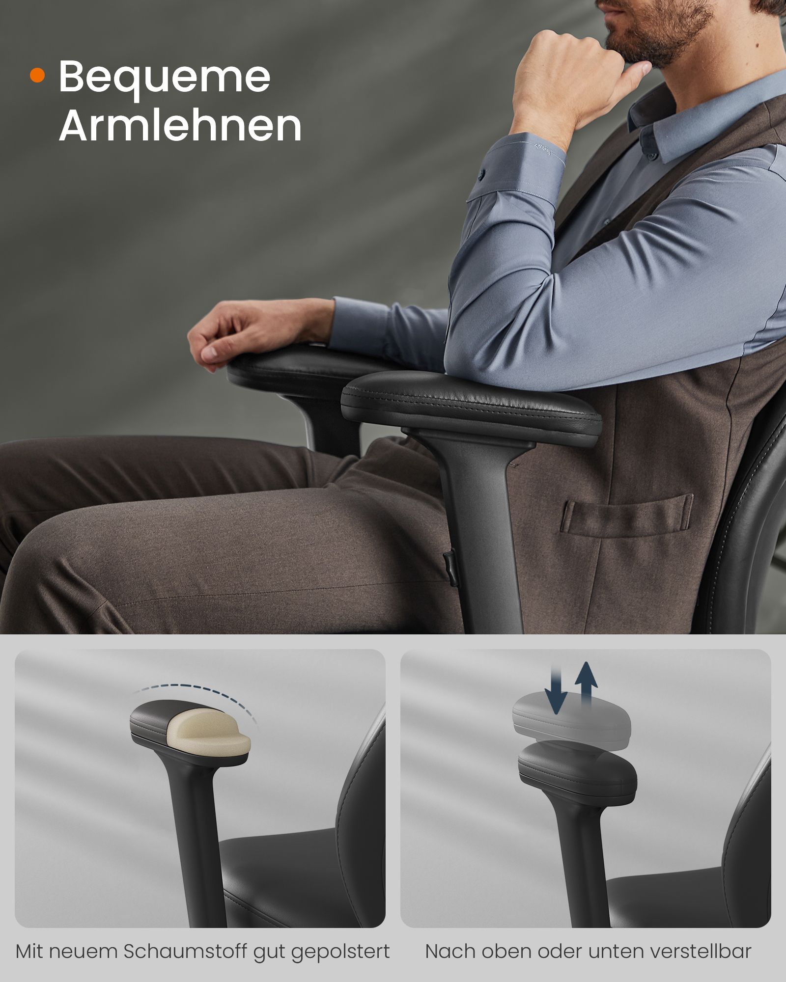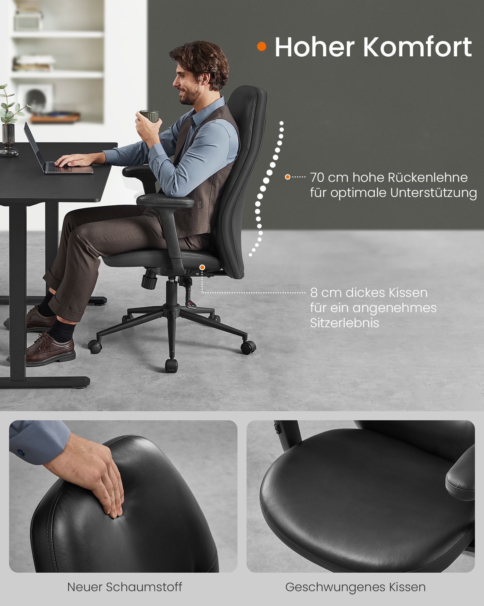 Pagaminta iš aukštos kokybės plieno, PU, plastiko ir putplasčio, ši kėdė yra tvirta ir patogi. Bendras dydis yra 70 x 70 x (114-122) cm, o sėdynės aukštis reguliuojamas nuo 50 iki 58 cm.