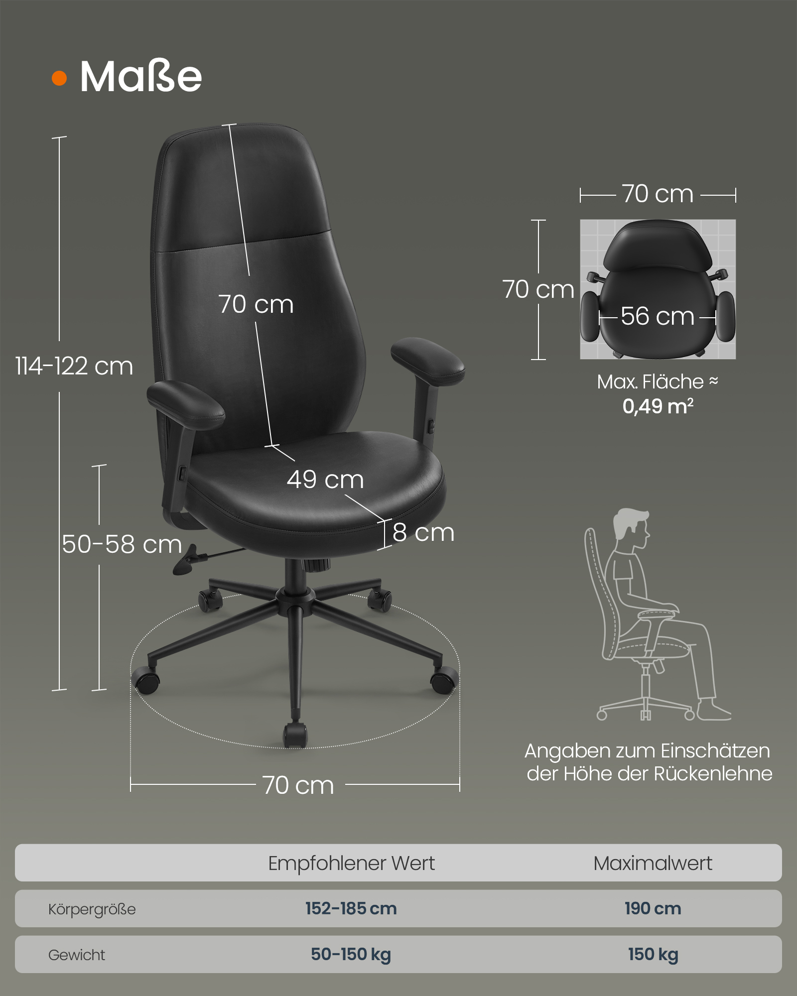 Sėdynės dydis yra 49 x 56 cm, o kėdės svoris siekia 17,1 kg. Maksimali statinė apkrova yra 150 kg, užtikrinanti patikimą ir saugų naudojimą.
