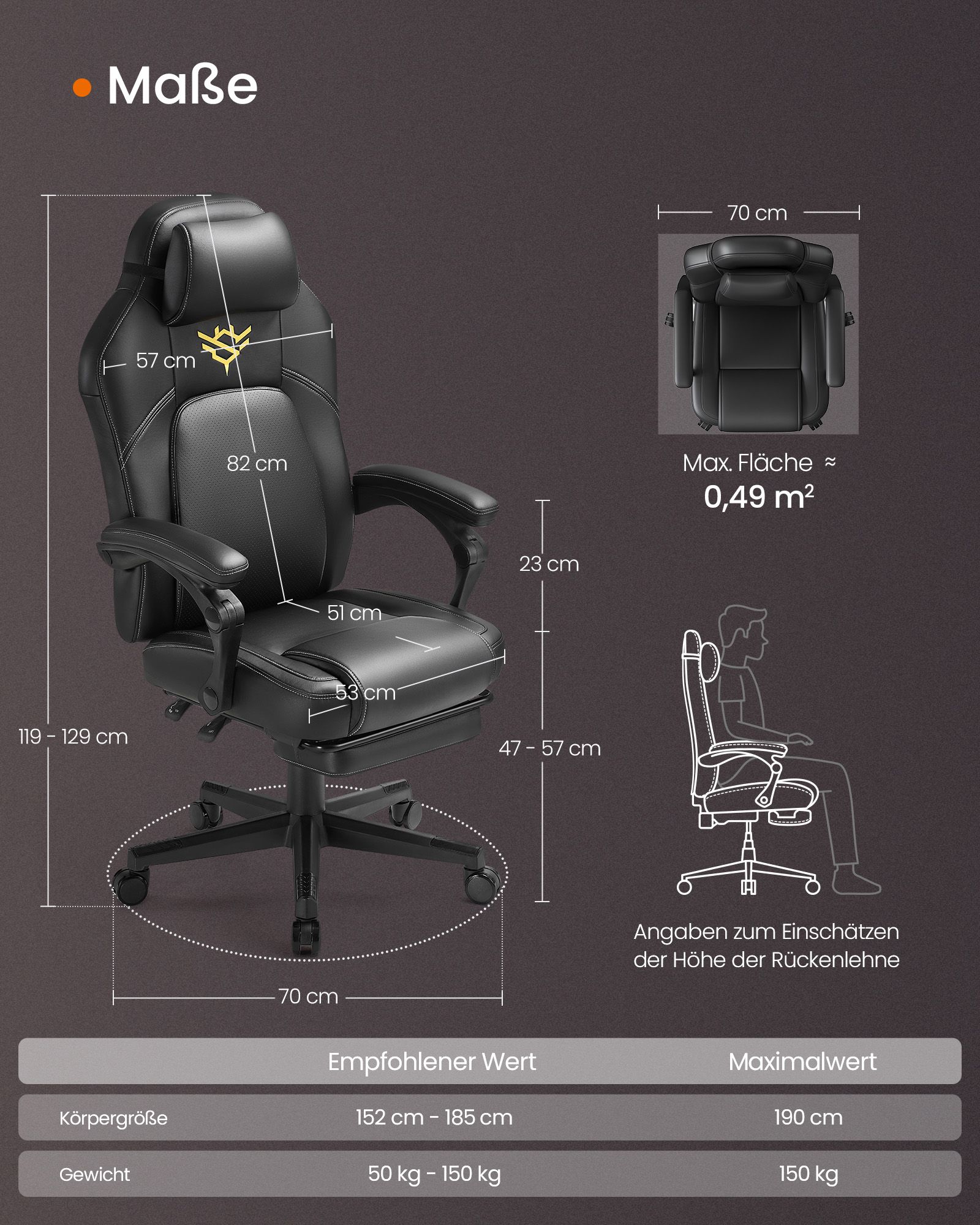Sėdynės dydis yra 53 x 51 cm (I x P), o porankių aukštis nuo sėdynės yra 23 cm. Kėdės svoris siekia 18,9 kg, o maksimali statinė apkrova yra 150 kg.