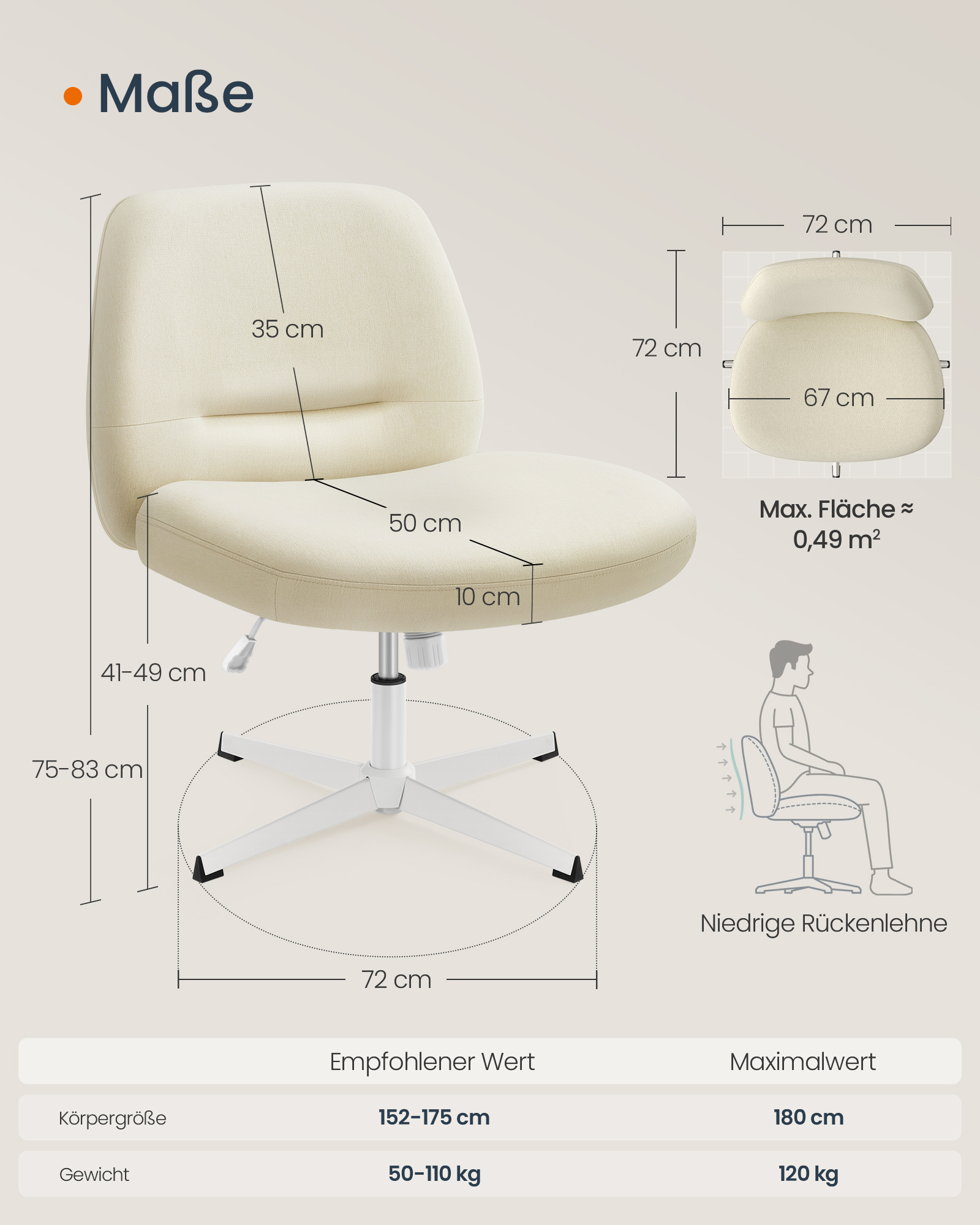 - Matmenys: 72 x 72 x (75-83) cm