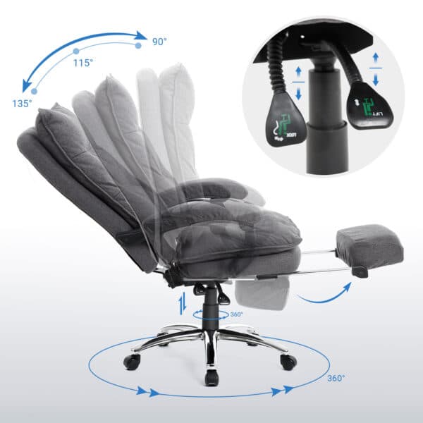 - Kitos specifikacijos: Su atrama kojoms, reguliuojamu atlošu, apkraunama iki 150 kg, ergonomiška biuro kėdė