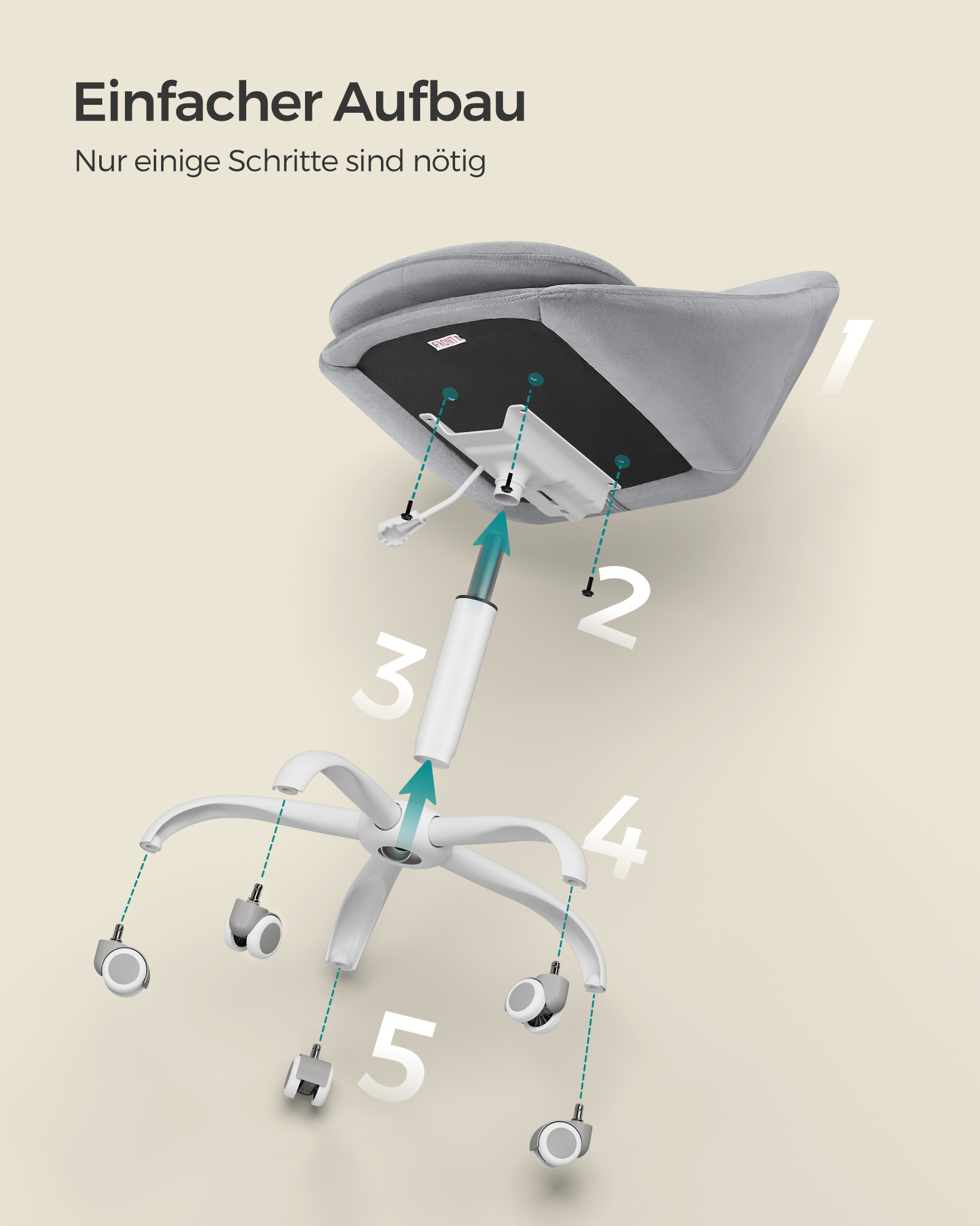 Pagaminta iš aukštos kokybės plieno rėmo, aksomo ir nailoninių ratų, ši kėdė yra tvirta ir ilgaamžė. Paminkštinimas iš 28 kg/m³ putplasčio užtikrina patogų sėdėjimą. Kėdės matmenys yra 60 x 60 x (80-90) cm, o sėdynės aukštis reguliuojamas nuo 47 iki 57 cm.