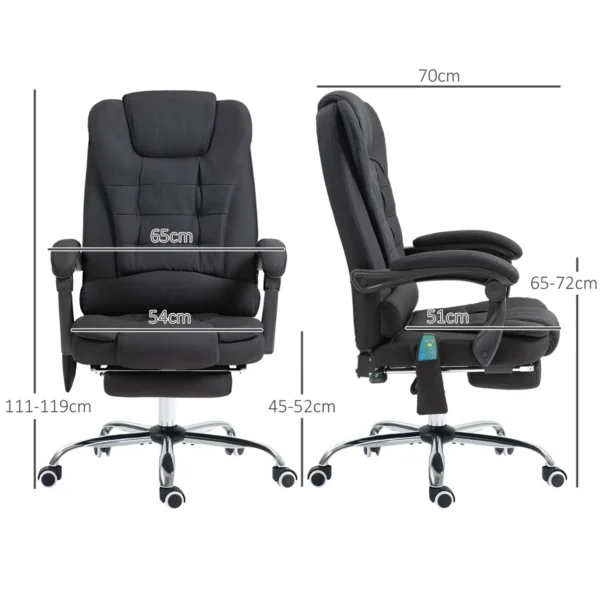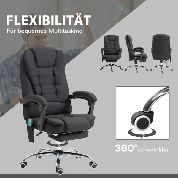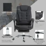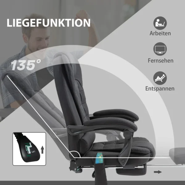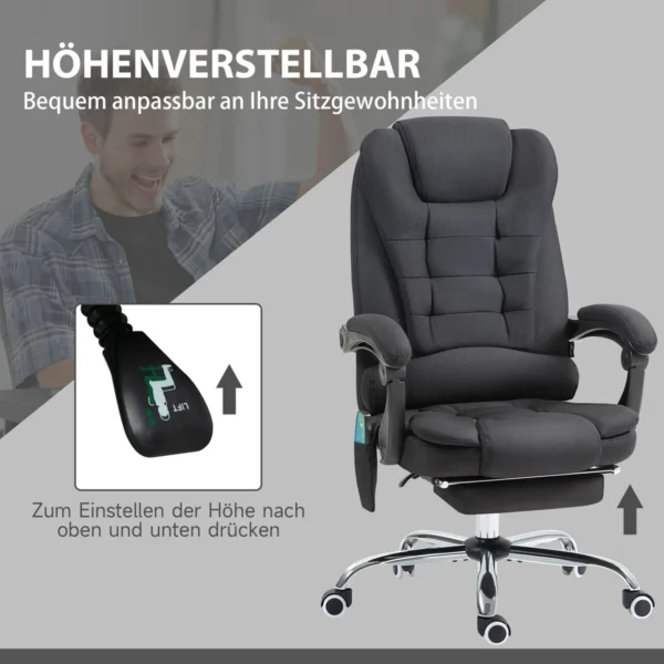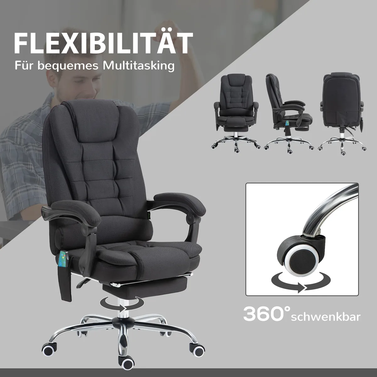 Paverskite savo biurą atsipalaidavimo oaze su Vinsetto biuro kėde su masažo funkcija. Šis minkštu audiniu aptrauktas biuro fotelis sujungia stilingą komfortą ir funkcionalumą. Jame yra šeši šildomi masažo taškai, keturi nugaroje ir du sėdynės srityje, kuriuos galima lengvai valdyti nuotolinio valdymo pulteliu, todėl jis siūlo optimalų atsipalaidavimą. Be to, atlošas, kurį galima pakreipti iki 135° kampu, ir rankinė pėdų atrama leidžia puikiai gulėti.