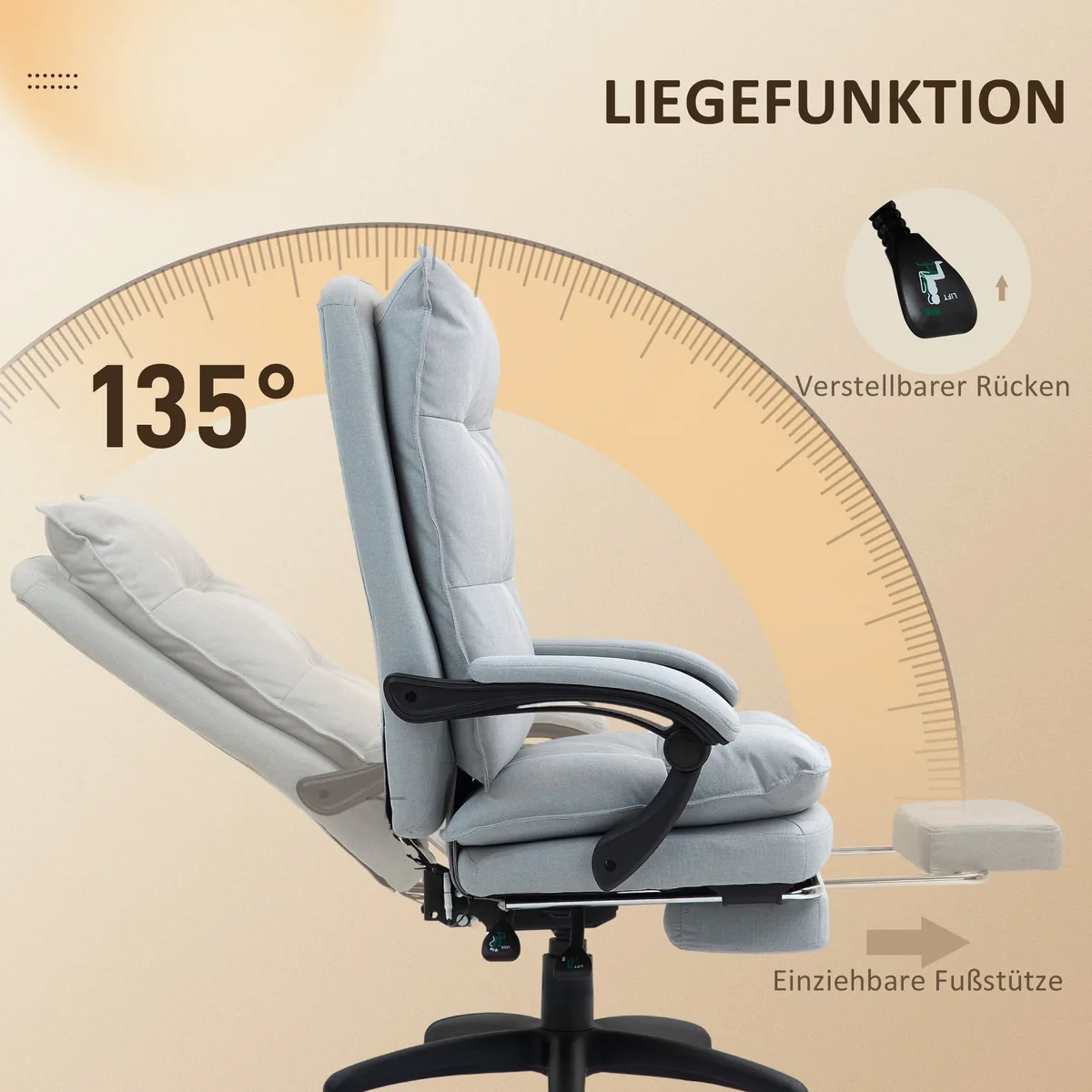 - ✔ Stalo kėdės atlošo kampą galima reguliuoti iki 135 laipsnių, įskaitant ištraukiamą pėdų atramą