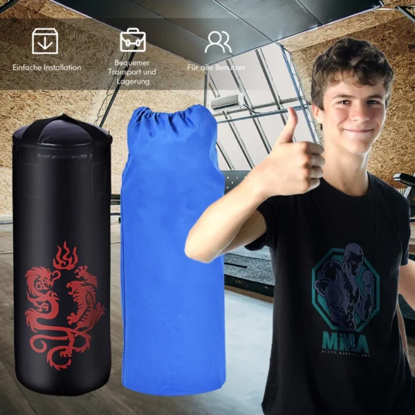 Bokso kriaušė 28x28x70 cm, juodos spalvos, skirta įvairių kovos sporto šakų treniruotėms. Ši bokso įranga ypač tinka vaikams ir jaunimui, padeda ugdyti jėgą, ištvermę bei koordinaciją. Komplektą sudaro bokso maišas, pirštinės, šokdynė bei tvirtinimo detalės, leidžiančios patogiai ir saugiai atlikti treniruotes namuose ar sporto salėje.