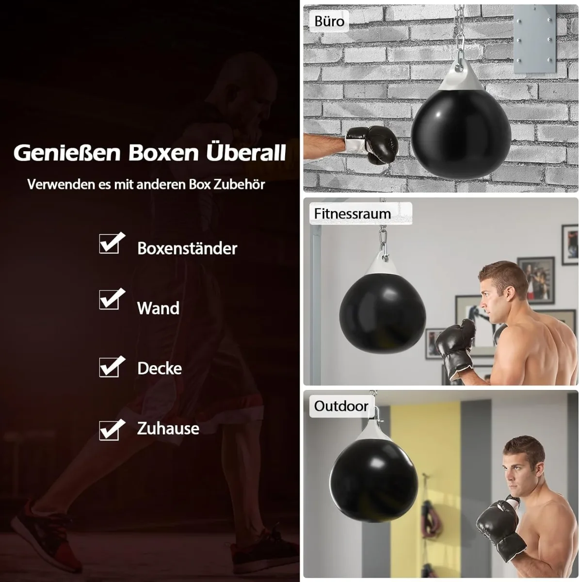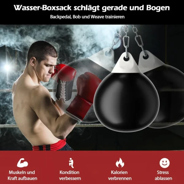 - Vandens pripildytas bokso maišas sugeria smūgius ir suteikia patogų elastingumą.