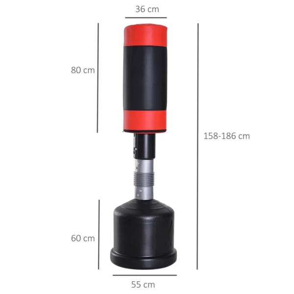Su šiuo tvirtu stovinčiu HOMCOM bokso krepšiu galite treniruotis namuose kaip bokso sporto salėje! Bokso stovo aukštis reguliuojamas trimis kryptimis nuo 158 cm iki 186 cm ir turi optimalų paminkštinimą. Tokiu būdu jūsų smūgiai švelniai sugeriami, kad apsaugotumėte sąnarius ir išvengtumėte traumų. Tvirtas stovas gali būti užpildytas smėliu arba vandeniu ir išlaiko stovintį bokso maišą stabilų, kol jis siūbuoja pirmyn ir atgal per smūgius.