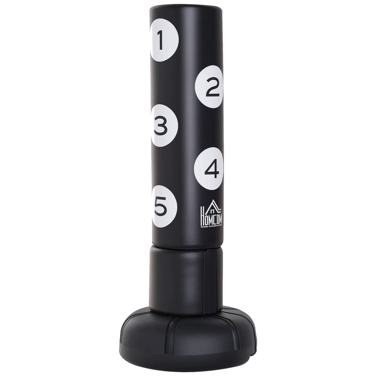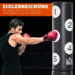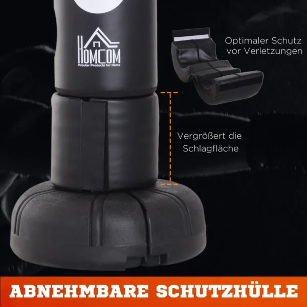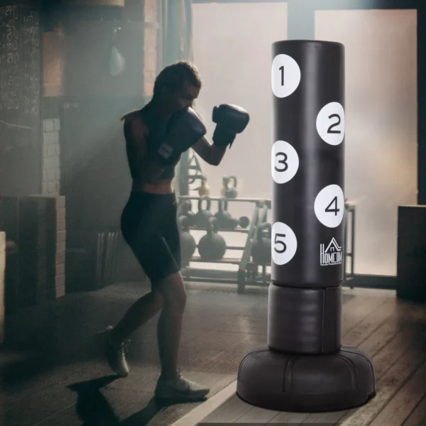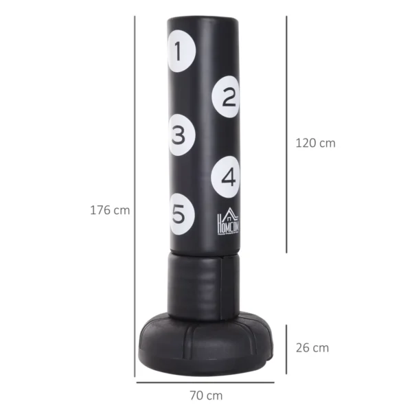 Su HOMCOM stovinčiu bokso maišu treniruotis namuose paprasta ir saugu. Tvirtas plastikinis pagrindas, kurį galima užpildyti vandeniu arba smulkiu smėliu, užtikrina stabilų stovą. Stovimojo bokso maišo štampavimo paviršius yra patvarus ir paminkštintas, o dėl FLEX sistemos bokso stovas apsaugo nuo smūgių ir smūgių, kad nesusižeistumėte. Paviršiaus numeracija taip pat leidžia tiksliai treniruoti kabliukus, smūgius ir spyrius, o surinkimas ir užpildymas yra greitas ir paprastas.