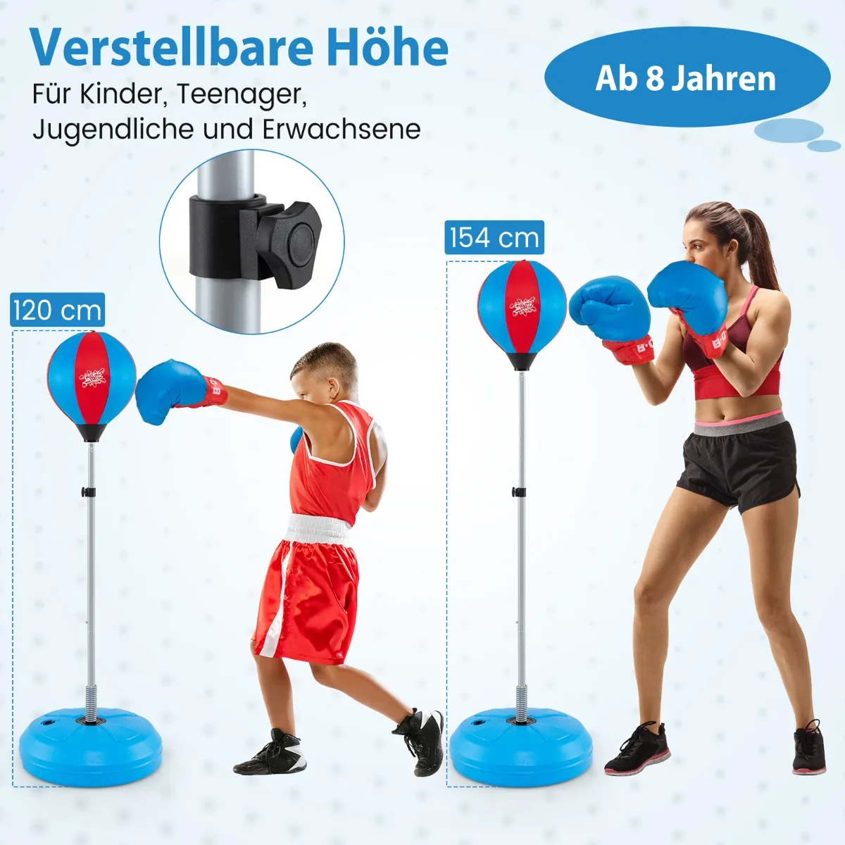 - Laisvai stovinti bokso kriaušė su smūgio kamuoliu, reguliuojamu nuo 120 cm iki 154 cm aukščio.