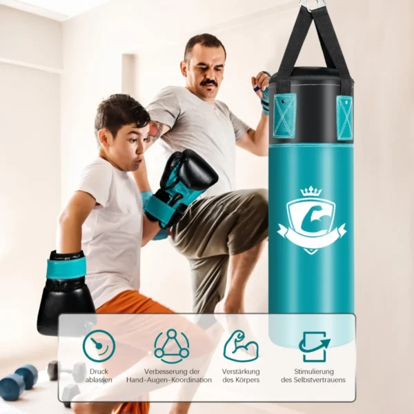 Bokso kriaušė vaikams 60x20x20 cm, žalios ir juodos spalvos, skirta vaikų sportinei veiklai ir koordinacijos lavinimui. Šis bokso maišelis padeda vaikams nuo 3 metų įsitraukti į boksą, karatė, taekwondo ir kitų kovos menų treniruotes saugiai ir patogiai. Daugiasluoksnė konstrukcija užtikrina ilgaamžiškumą ir smūgio amortizaciją.