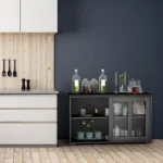- Grūdinto stiklo durys išryškina bufeto vidų.