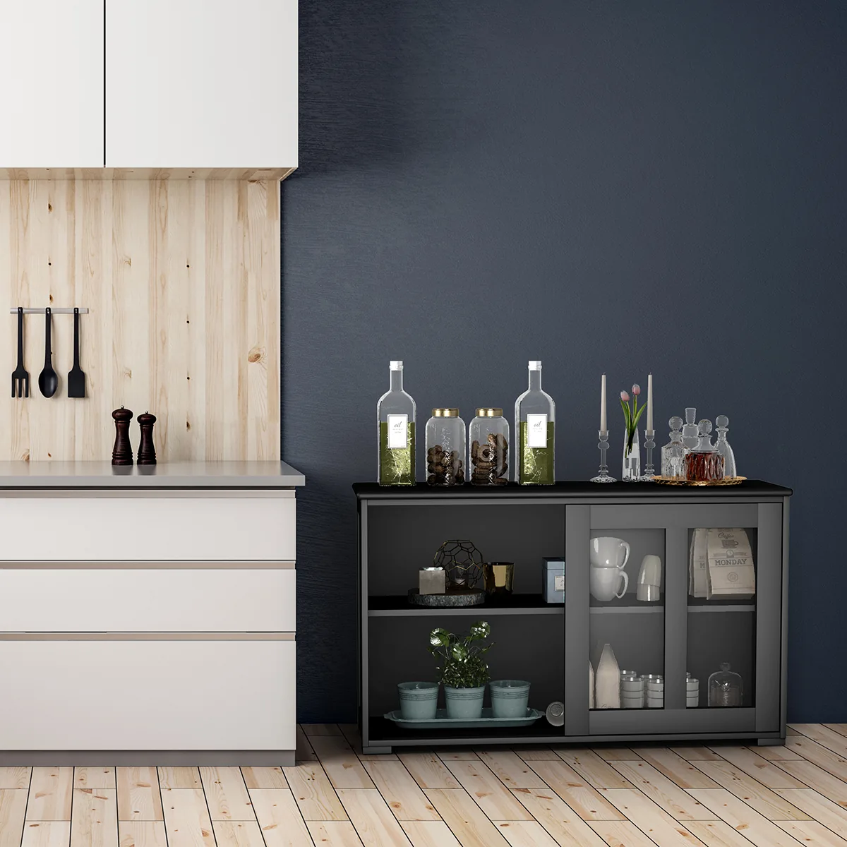 Bufetas 106,5x33x62,5 cm juodos spalvos – praktiškas ir funkcionalus sprendimas daiktų laikymui namuose ar biure. Pagamintas iš MDF medžiagos su grūdinto stiklo durelėmis, šis bufetas užtikrina patikimumą ir patogumą kasdieniam naudojimui.