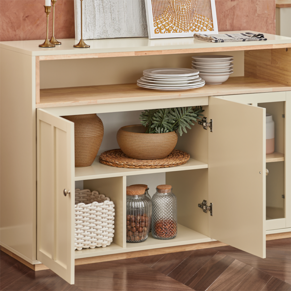 Dėl puikiai suprojektuotos saugojimo funkcijos, šis bufetas gali būti naudojamas virtuvėje indams ir prieskoniams laikyti, koridoriuje kaip įėjimo stalas arba net kaip televizoriaus staliukas. Tai idealus sprendimas prieškambariams, valgomiesiems, miegamiesiems ir kitoms erdvėms.