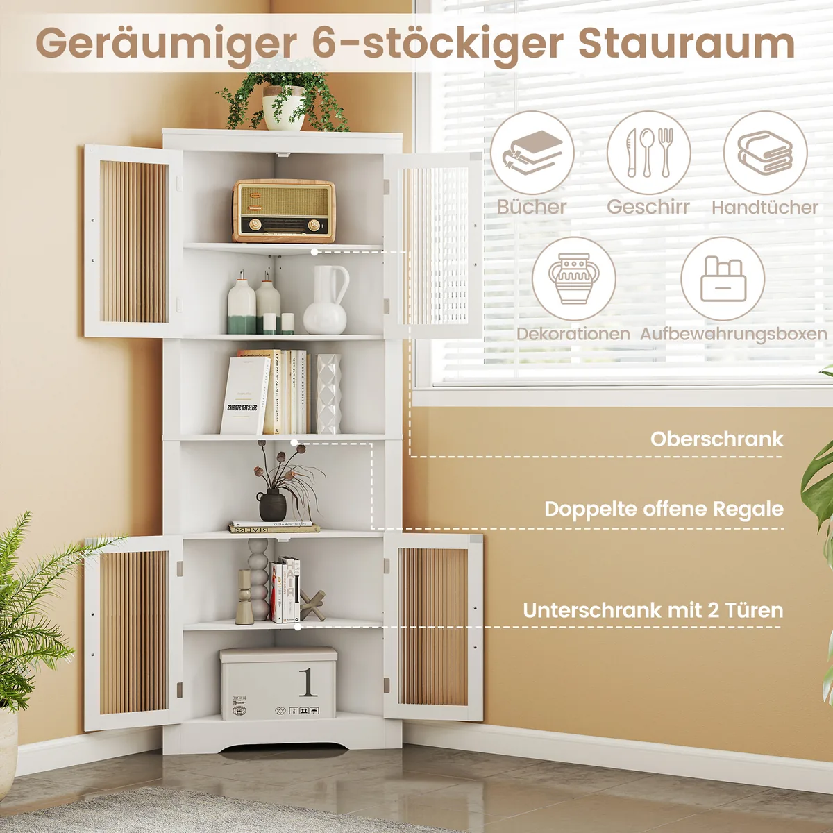 • 6 lygiai saugojimui – viršutinė spintelė, dvi atviros lentynos ir apatinė dviejų durų spintelė