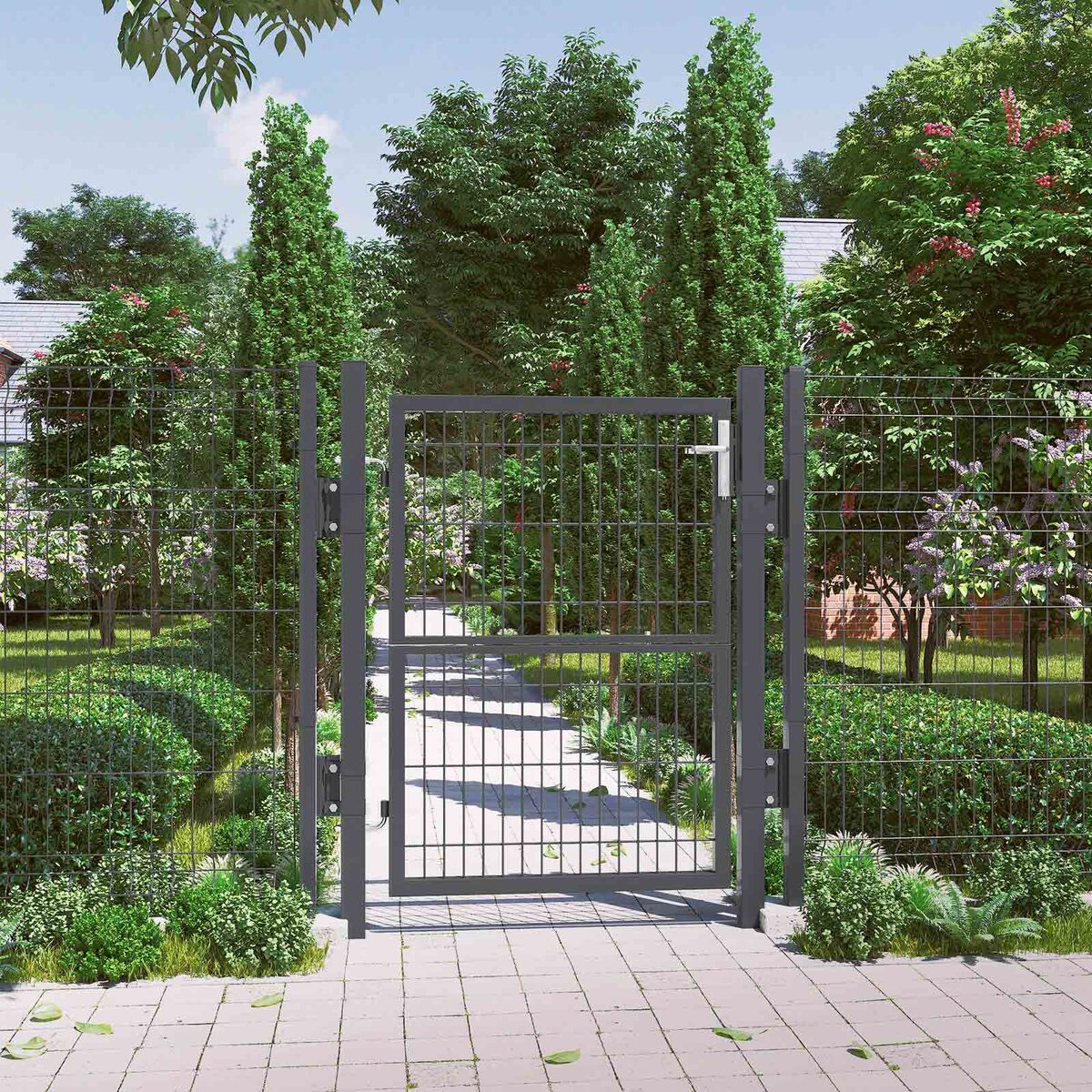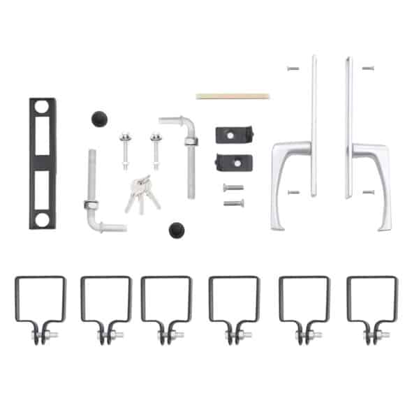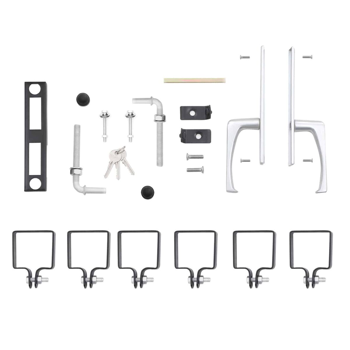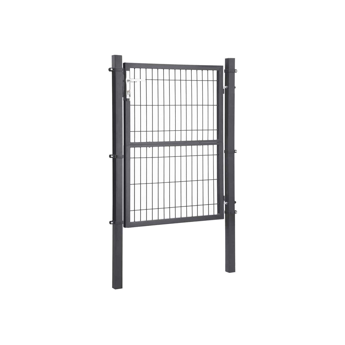 Viskas įskaičiuota, taip pat kokybė! Komplektą sudaro: 1 tvirtos grotelių durys, 2 tvirti stulpeliai iš milteliniu būdu dengtos cinkuotos geležies, 2 vyriai, 1 kokybiška spyna su 3 raktais, 1 rankena iš nerūdijančio aliuminio ir 6 tvirtinimo spaustukai. Visa tai užtikrina šių sodo vartų ilgaamžiškumą ir atsparumą korozijai.