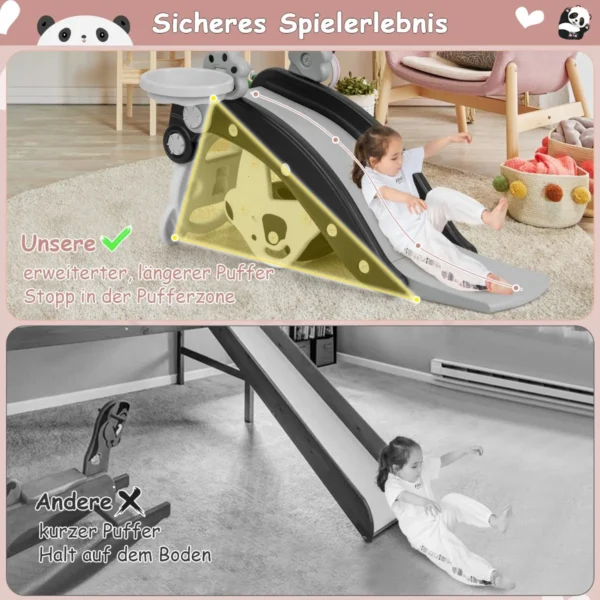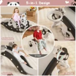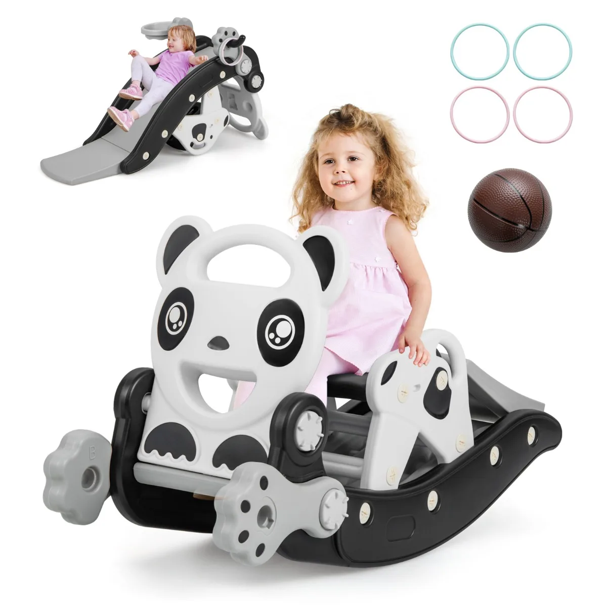 Čiuožykla 105x72x57cm, juodos ir pilkos spalvos, skirta vaikų aktyviam žaidimui ir fizinei veiklai. Pagaminta iš saugios ir patvarios HDPE medžiagos, ši čiuožykla puikiai tinka vaikams nuo 1 iki 5 metų. Kompleksinis žaidimų rinkinys apima ir supamą žirgą bei papildomas pramogas, užtikrinant smagų ir saugų laisvalaikį.