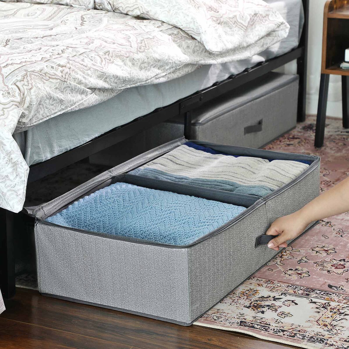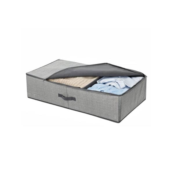 Paslėpta drabužių saugykla: Šis po lova esantis laikiklis leidžia išnaudoti brangią spintos vietą drabužiams, kuriuos nešiojate kiekvieną dieną. Padėkite laikymo maišelį, pagamintą iš patvarios lino imitacijos, pavyzdžiui, po lova arba ant spintos. Kai nenaudojama, dėžę taip pat galima sulankstyti, kad sutaupytumėte vietos, ir sudėti į kampą.