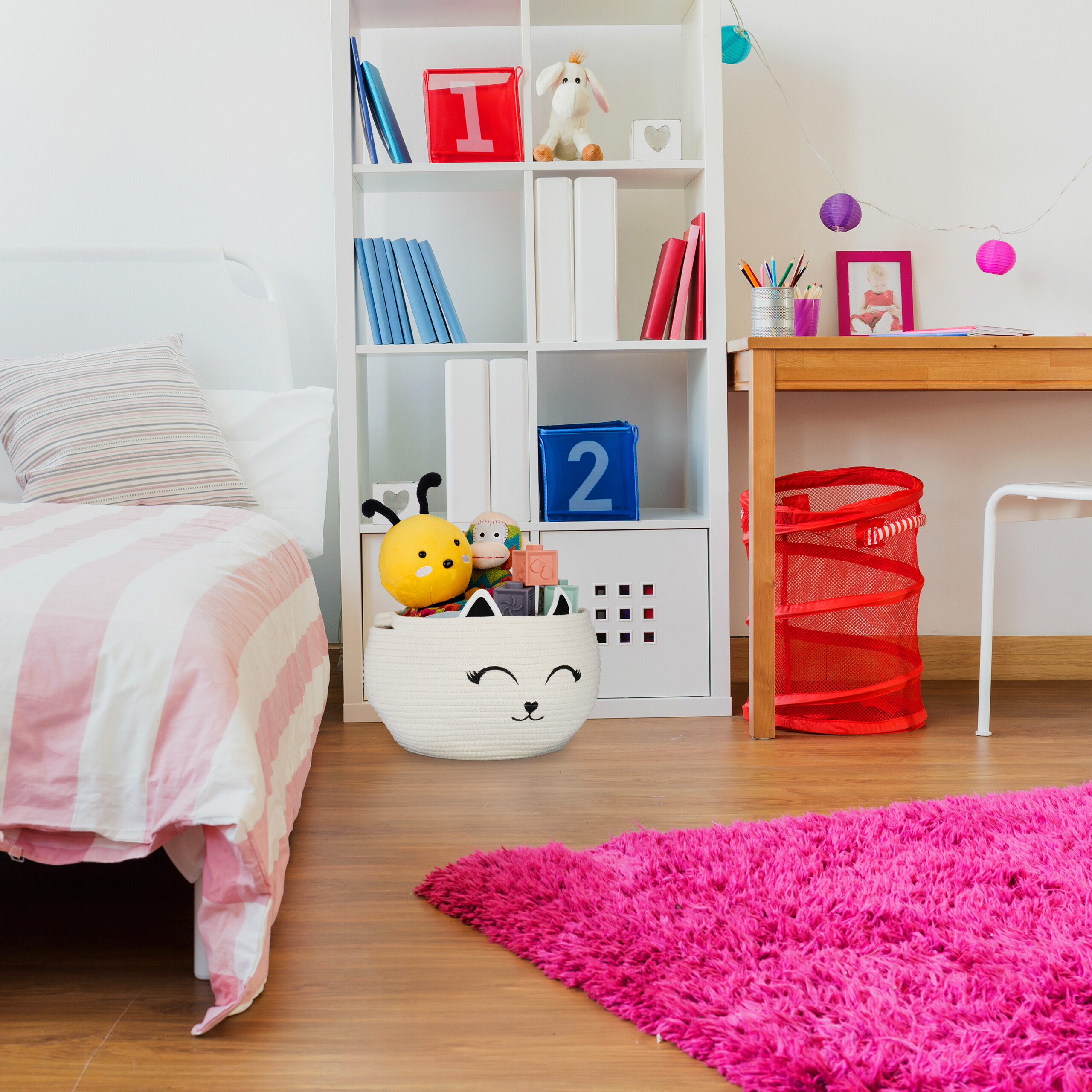 - Daugiafunkcinis naudojimas: Idealiai tinka žaislams, statybinėms kaladėlėms, pliušiniams žaislams ir kitiems daiktams laikyti. Taip pat puikiai tinka kaip krepšys ant persirengimo stalo.