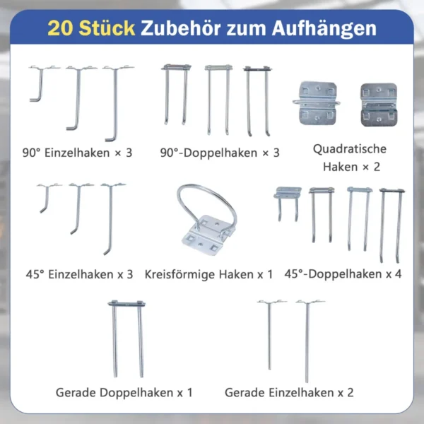 - Pridedama 20 pakabinamų kabliukų skirtingų formų ir kampų įrankių tvarkymui.